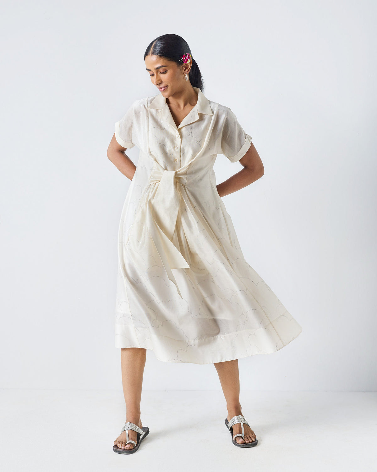 The Cadeau Dress is crafted from luxurious cotton silk fabric, featuring a soft ivory base adorned with a shimmering silver cloud print, creating a serene, ethereal look.
