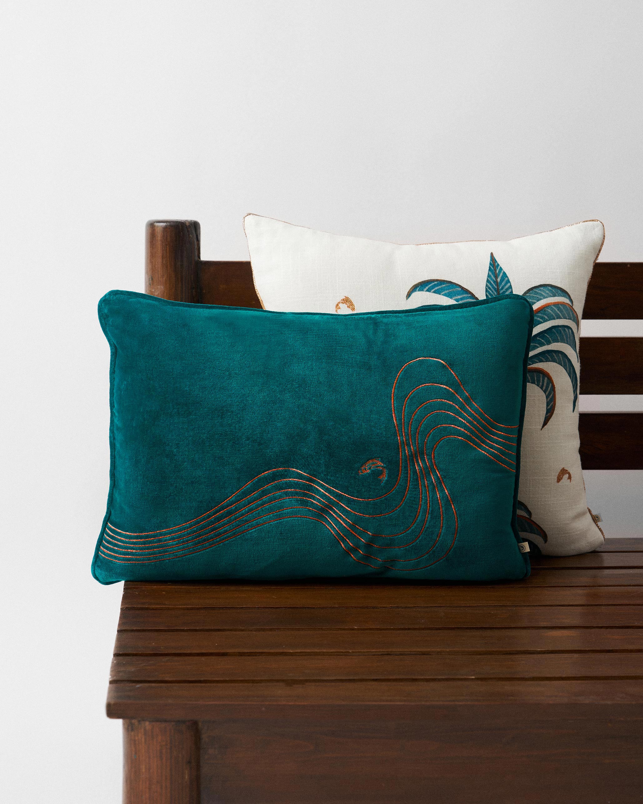 Alive with detail and hue, the Dusk Lumbar Cushion Cover brings cloud-like softness to spaces. The cushion features copper contour lines embroidered on a lush velvet base.
