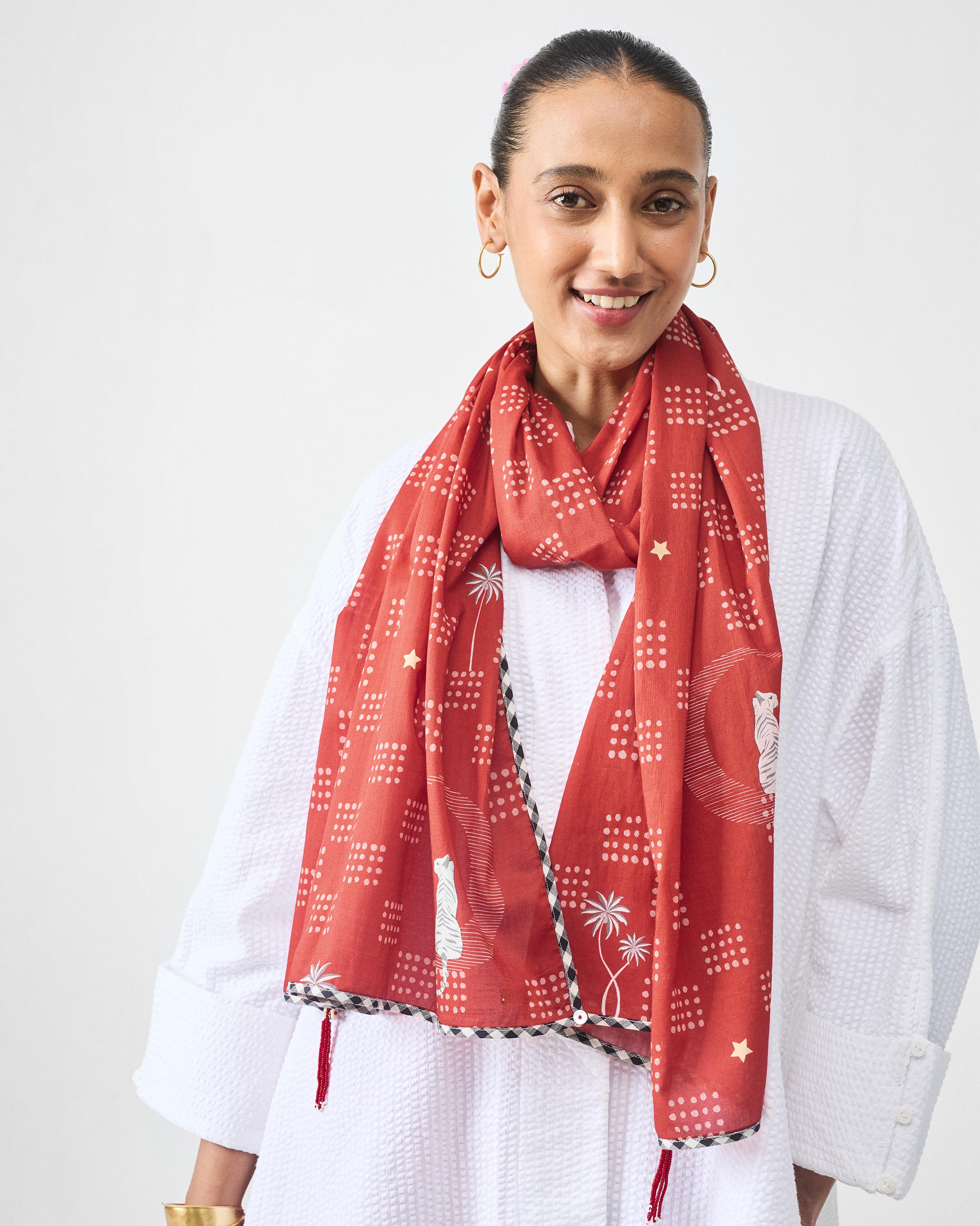 {"id":7946372513972,"title":"Tiger Walk Scarf - Brown","handle":"tiger-walk-scarf-brown","description":"\u003cul\u003e\n\u003cli\u003eThe Tiger Walk Scarf is a jungle tale—dotted squares, palm trees, and a resting tiger under a crescent moon.\n\u003c\/li\u003e\n\u003cli\u003eTerracotta brown meets checkered borders and detailed beaded corners. A wild walk, paused in time.\n\u003c\/li\u003e\n\u003cli\u003eLight, breezy, and effortlessly chic, this scarf is perfect for summer styling.\u003c\/li\u003e\n\u003c\/ul\u003e","published_at":"2025-05-21T11:18:31+05:30","created_at":"2025-05-20T13:27:11+05:30","vendor":"Nicobar","type":"Scarves","tags":["COLLECTION_Safar","Filtercategory_Accessories","Material Group_Cotton","MATERIAL_100% Cotton","notify_me_on","pdpcollection_Safar","Product_Others","sale_eoss13jun25","sale_eoss25jun25","sale_eoss25jun25_1","tiger-walk-scarf-brownNBI045498","Traveledit_EOSSjul'25"],"price":4500,"price_min":4500,"price_max":4500,"available":true,"price_varies":false,"compare_at_price":null,"compare_at_price_min":0,"compare_at_price_max":0,"compare_at_price_varies":false,"variants":[{"id":43924010008756,"title":"Brown \/ 54 cm x 204 cm","option1":"Brown","option2":"54 cm x 204 cm","option3":null,"sku":"NBI045498","requires_shipping":true,"taxable":true,"featured_image":null,"available":true,"name":"Tiger Walk Scarf - Brown - Brown \/ 54 cm x 204 cm","public_title":"Brown \/ 54 cm x 204 cm","options":["Brown","54 cm x 204 cm"],"price":4500,"weight":0,"compare_at_price":null,"inventory_management":"shopify","barcode":null,"requires_selling_plan":false,"selling_plan_allocations":[],"quantity_rule":{"min":1,"max":null,"increment":1}}],"images":["\/\/global.nicobar.com\/cdn\/shop\/files\/NBI045498_1.jpg?v=1747728012","\/\/global.nicobar.com\/cdn\/shop\/files\/NBI045498_2.jpg?v=1747728012","\/\/global.nicobar.com\/cdn\/shop\/files\/NBI045498_3.jpg?v=1747728012"],"featured_image":"\/\/global.nicobar.com\/cdn\/shop\/files\/NBI045498_1.jpg?v=1747728012","options":["Color","Size"],"media":[{"alt":null,"id":31570109038772,"position":1,"preview_image":{"aspect_ratio":0.8,"height":2574,"width":2058,"src":"\/\/global.nicobar.com\/cdn\/shop\/files\/NBI045498_1.jpg?v=1747728012"},"aspect_ratio":0.8,"height":2574,"media_type":"image","src":"\/\/global.nicobar.com\/cdn\/shop\/files\/NBI045498_1.jpg?v=1747728012","width":2058},{"alt":null,"id":31570109071540,"position":2,"preview_image":{"aspect_ratio":0.8,"height":2574,"width":2058,"src":"\/\/global.nicobar.com\/cdn\/shop\/files\/NBI045498_2.jpg?v=1747728012"},"aspect_ratio":0.8,"height":2574,"media_type":"image","src":"\/\/global.nicobar.com\/cdn\/shop\/files\/NBI045498_2.jpg?v=1747728012","width":2058},{"alt":null,"id":31570109104308,"position":3,"preview_image":{"aspect_ratio":0.8,"height":2574,"width":2058,"src":"\/\/global.nicobar.com\/cdn\/shop\/files\/NBI045498_3.jpg?v=1747728012"},"aspect_ratio":0.8,"height":2574,"media_type":"image","src":"\/\/global.nicobar.com\/cdn\/shop\/files\/NBI045498_3.jpg?v=1747728012","width":2058}],"requires_selling_plan":false,"selling_plan_groups":[],"content":"\u003cul\u003e\n\u003cli\u003eThe Tiger Walk Scarf is a jungle tale—dotted squares, palm trees, and a resting tiger under a crescent moon.\n\u003c\/li\u003e\n\u003cli\u003eTerracotta brown meets checkered borders and detailed beaded corners. A wild walk, paused in time.\n\u003c\/li\u003e\n\u003cli\u003eLight, breezy, and effortlessly chic, this scarf is perfect for summer styling.\u003c\/li\u003e\n\u003c\/ul\u003e"}