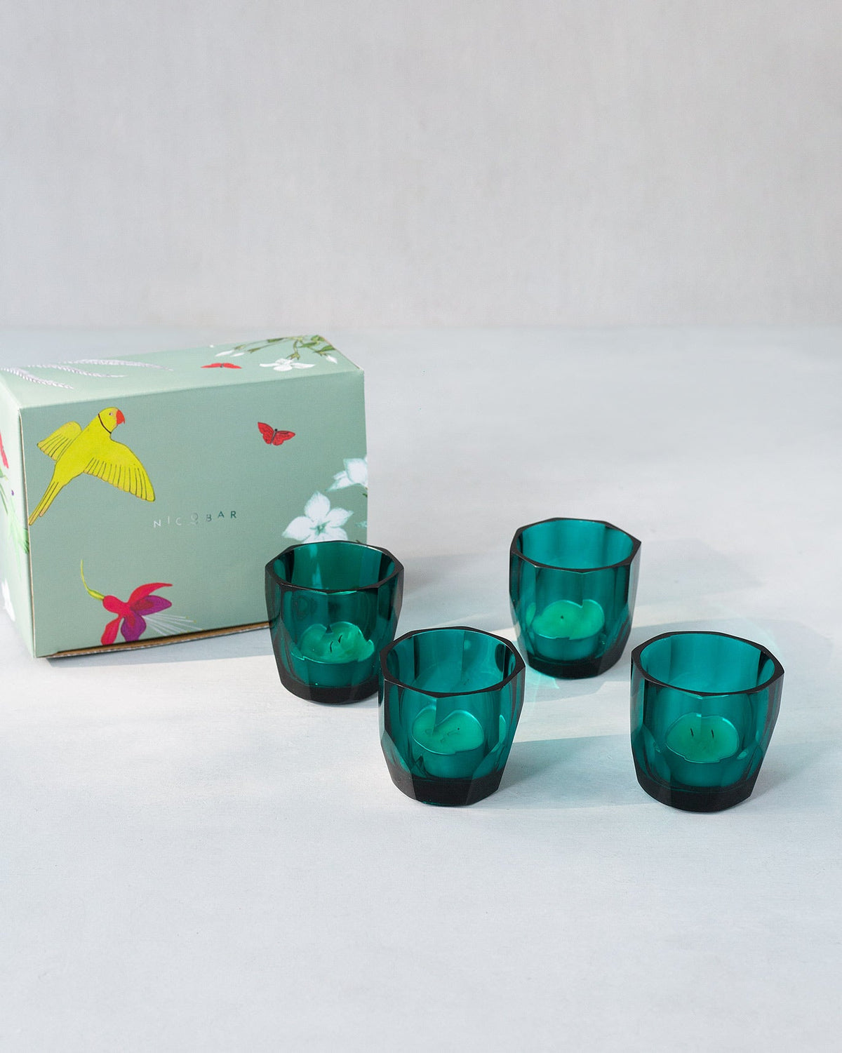 • Infuse your homes with these emerald cut-glass votives and the dancing flicker of candlelight