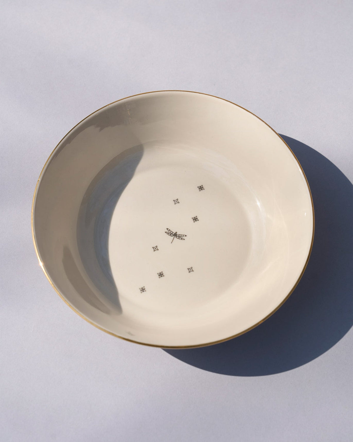 • Crafted in lightweight, glazed stoneware with motifs of flitting dragonfly and golden stars