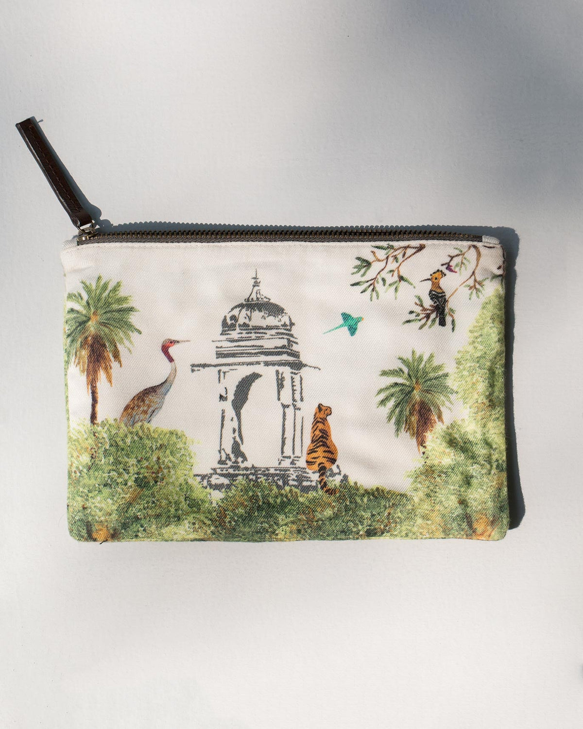 Featuring a charming print that captures the essence of Sher Bagh, Ranthambore, this travel pouch is dotted with the region's local flora and fauna - the tiger, hoopoe birds, cranes, and the sangri tree