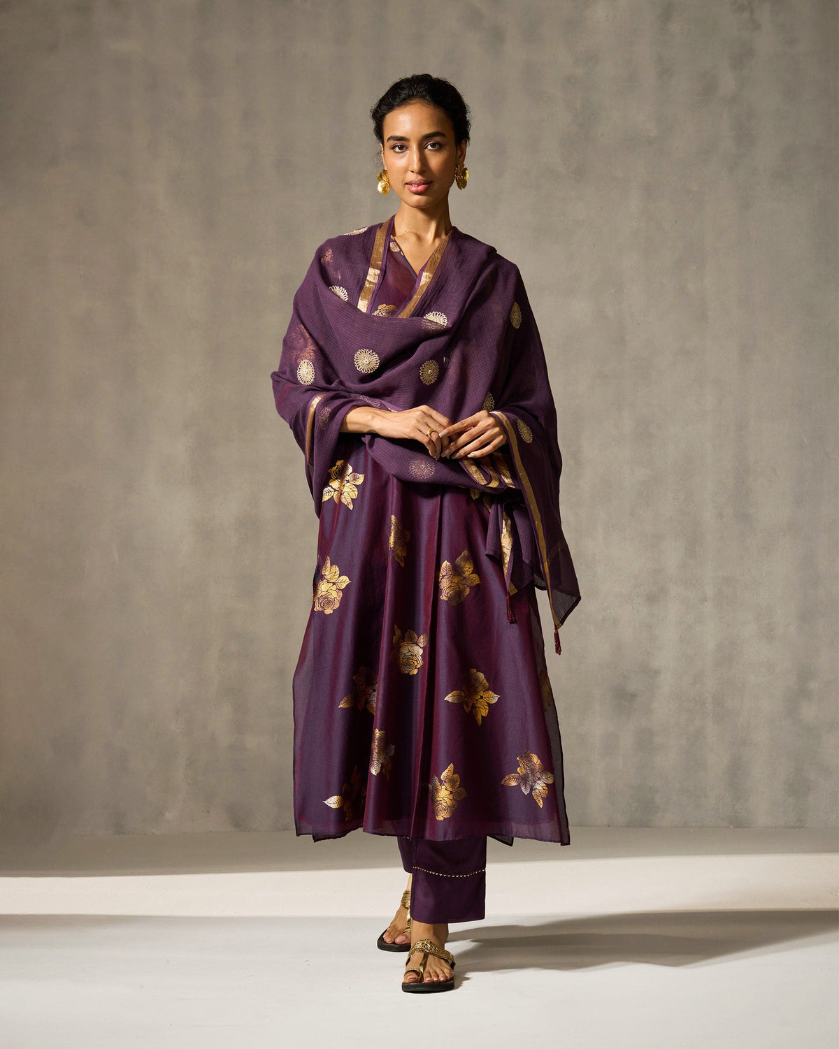 • The Dusk Dupatta features embroidered gold flowers on a rich purple base.