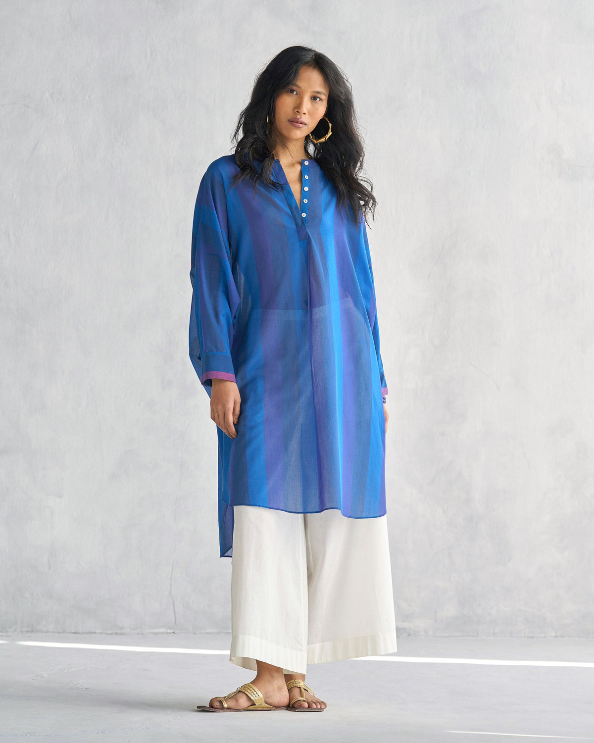 The Lazy Sunday Tunic’s blue tonal stripes make it your go-to choice for easy and stylish weekend wear. The hints of red at the cuffs of the sleeves and on the back make it stand out.