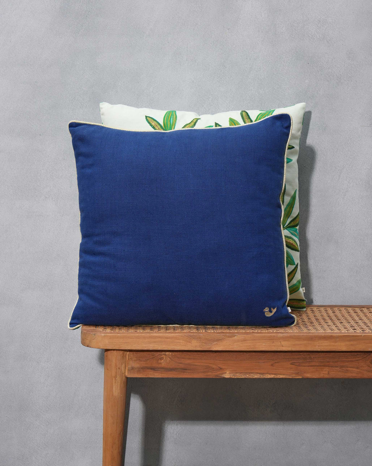 • The Desert Lagoon Cushion Cover comes in solid green and blue with a golden zari embroidered motif inspired by our travels to Morocco.