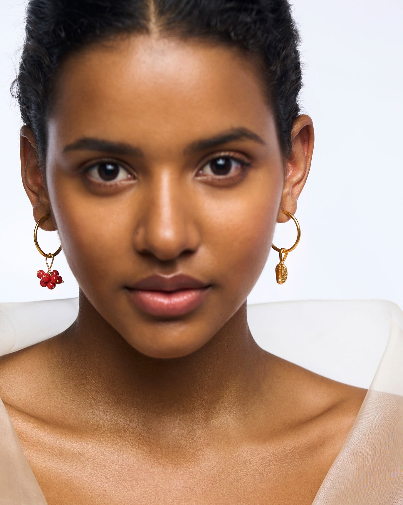 • The earrings are in a mismatched style.