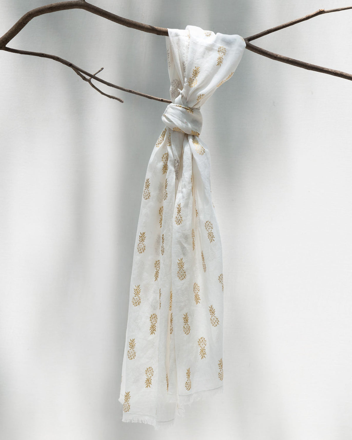 • This oblong scarf is peppered gold foil printed pineapples and pairs well with bold outfits