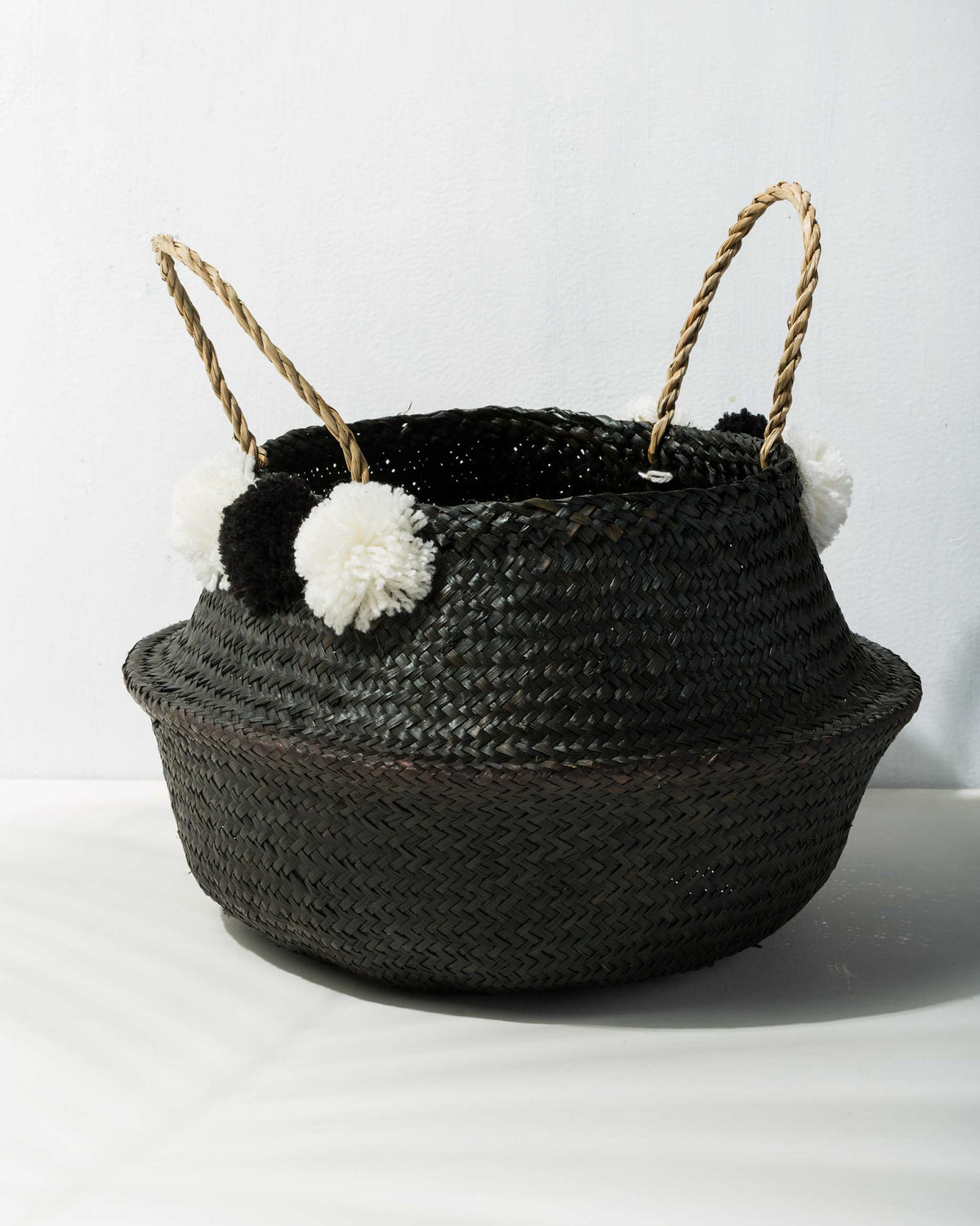 In a strong black, featuring monochrome pom poms, this bohemian basket is perfect for creating a coastal vibe at home.