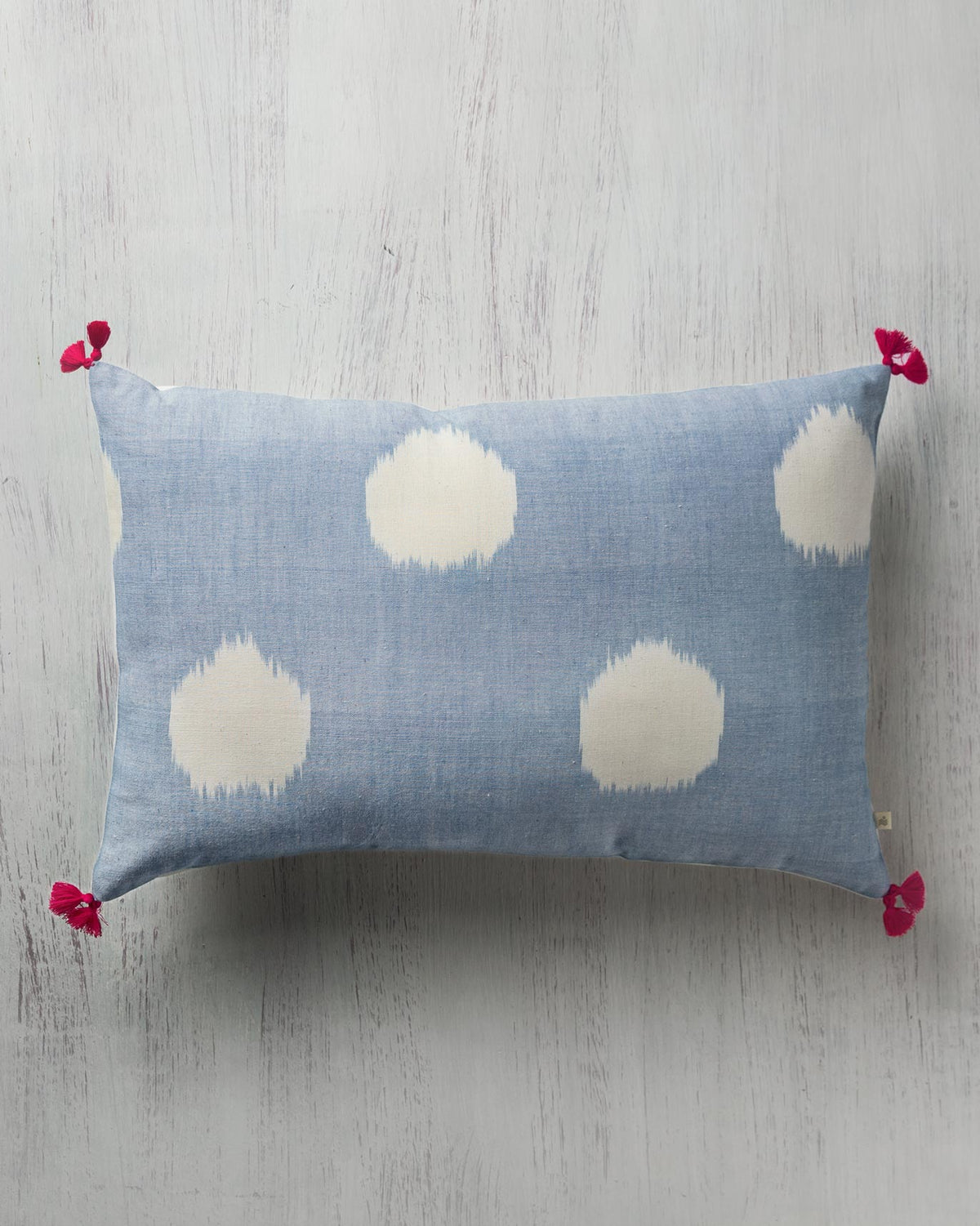 A soft blue base peppered with big white polkas and yellow pom poms to add a little flourish, this cushion is perfect to fill out a cosy corner in your home