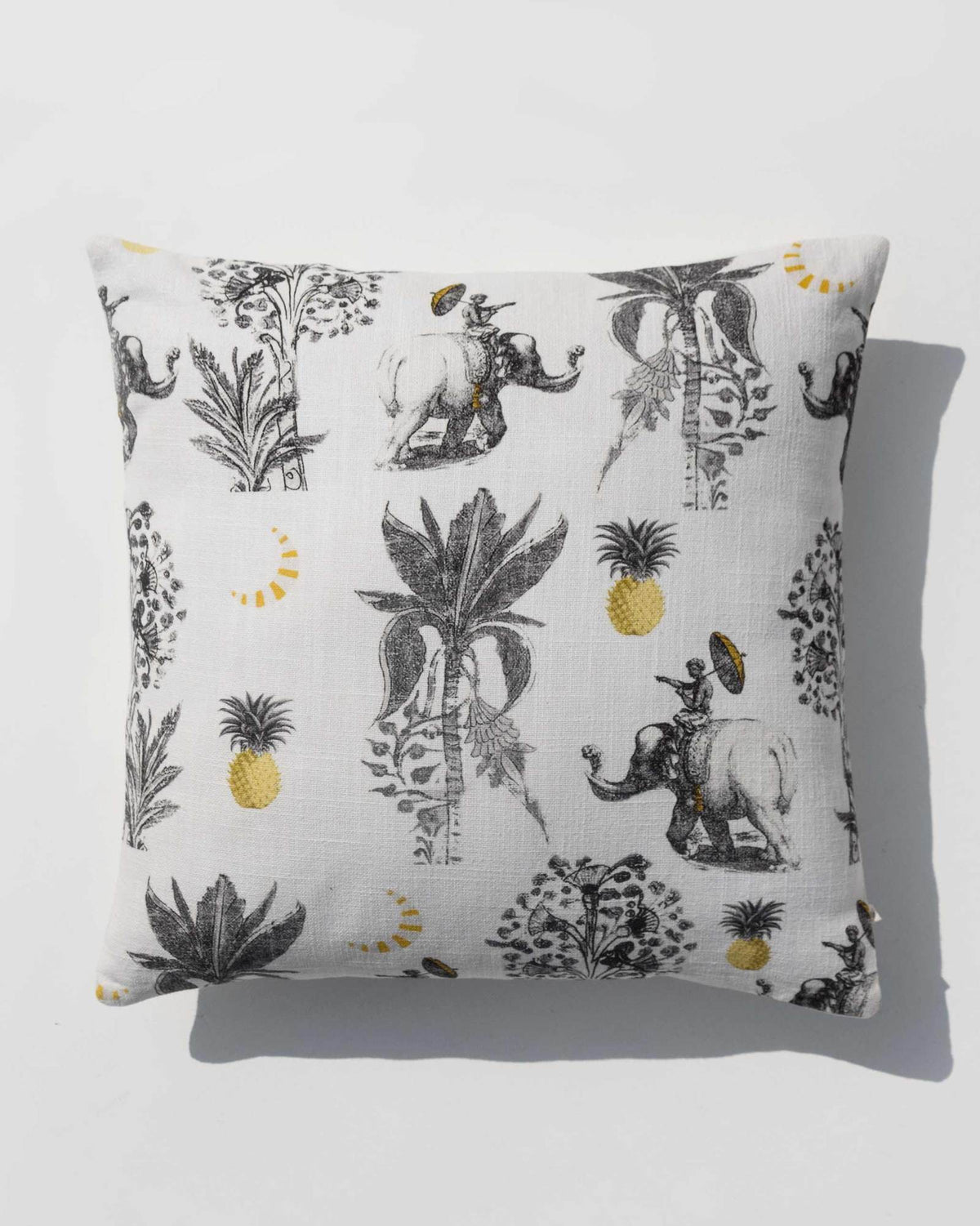 Printed with elephants and palms as an ode to the tropics, these deliciously soft cushions feature the slightest play of yellow and an envelope enclosure with ties