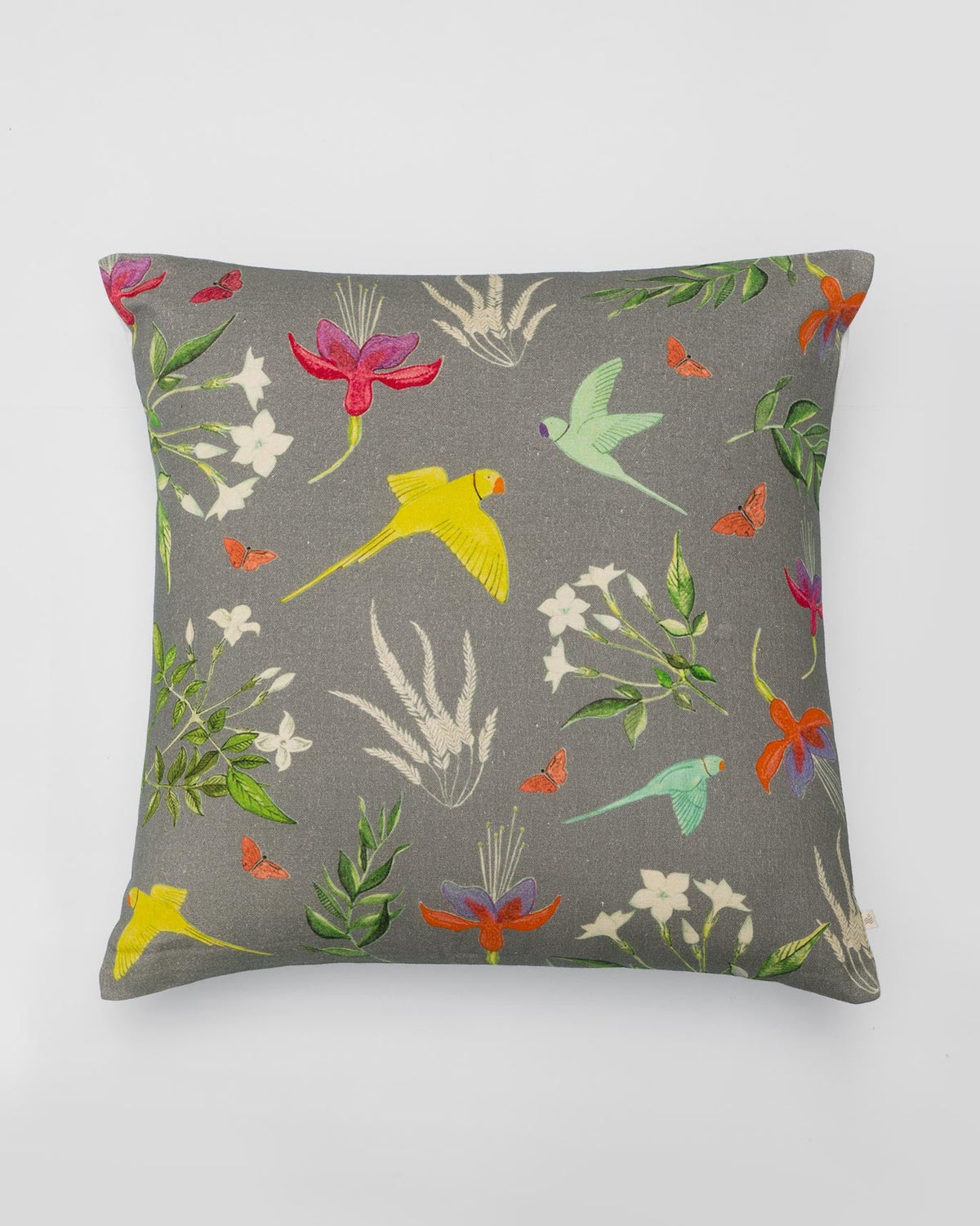 In classic charcoal, this cushion is strewn with tropical motifs, features an envelope enclosure with ties at the back, and will stay with you through the seasons