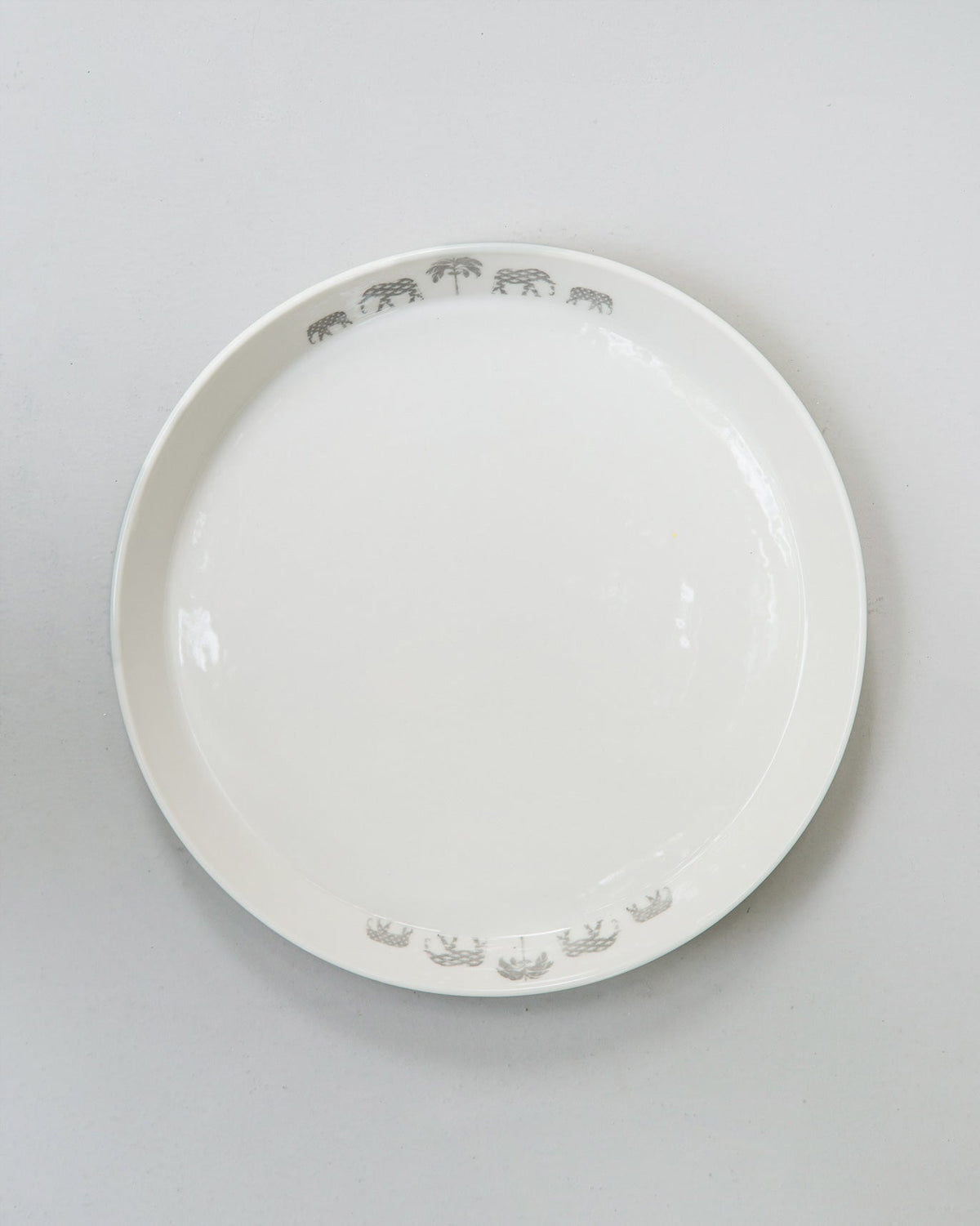 • Right out of a scene from Negombo, Sri Lanka, our stoneware pasta plate comes in natural ecru, printed with tiny Nico elephants and palms along the rim