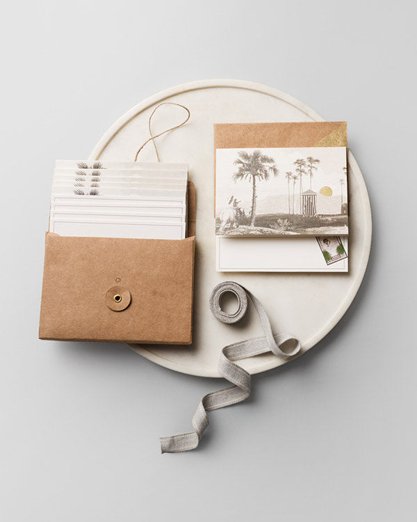 • In little brown boxes held shut with twine, this stationery set brings the twinkle of gold to your study table