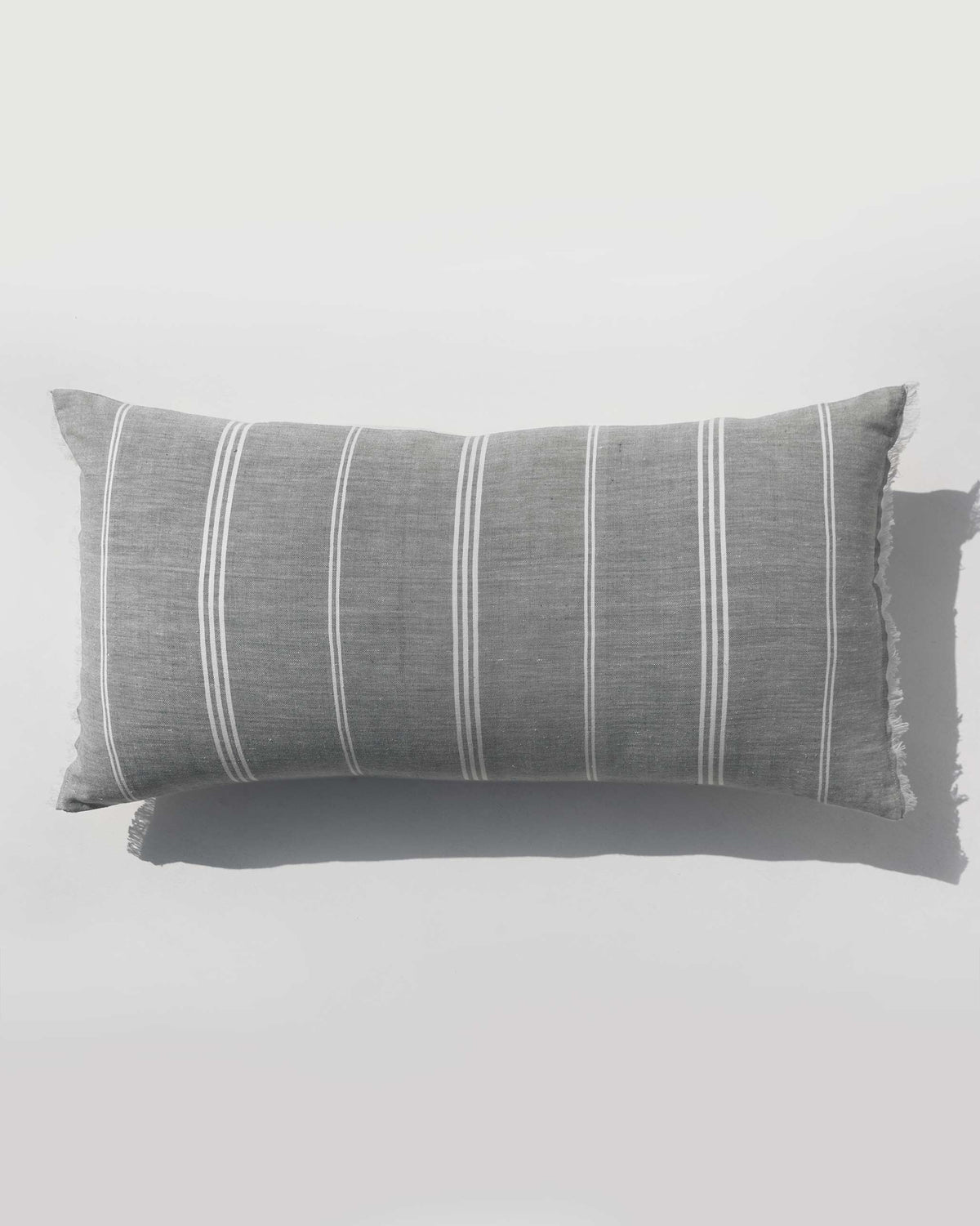 • A play of soft grey and white, this cushion features our favourite stripe, frayed edges and an envelope enclosure with ties