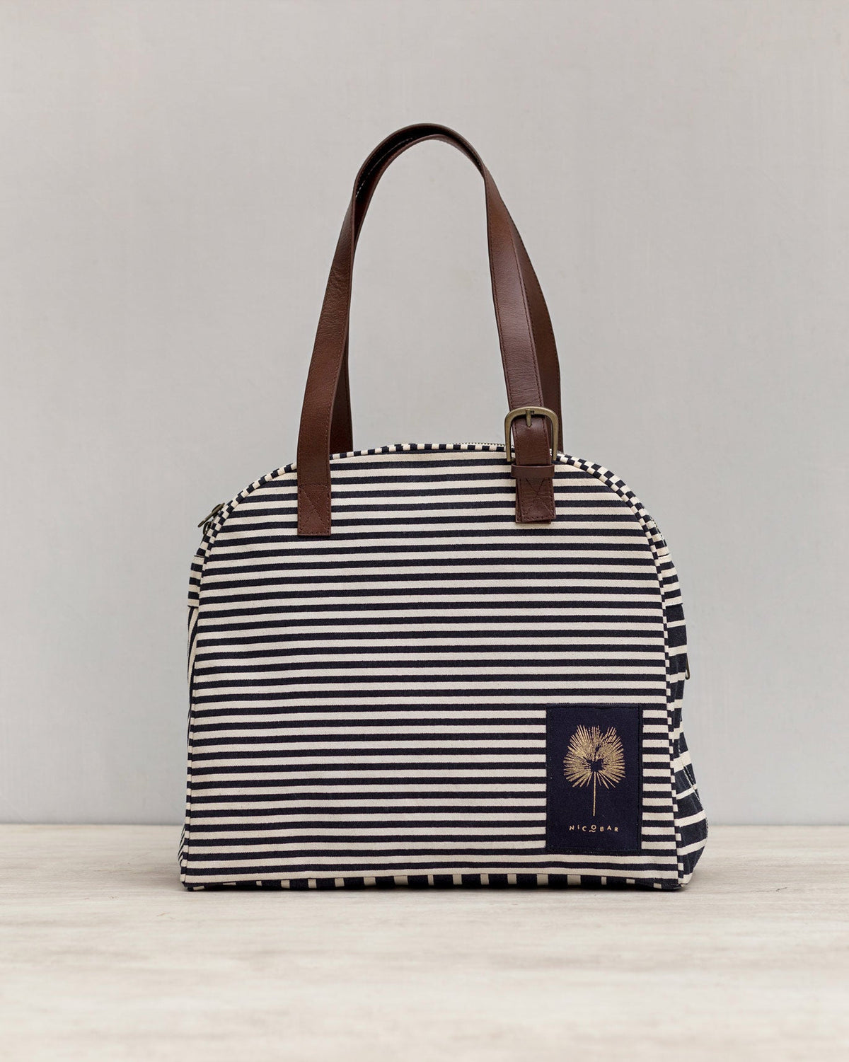 In hard-wearing canvas, this striped bag packs a punch with a whole bunch of zippers and compartments, and a cheery lining