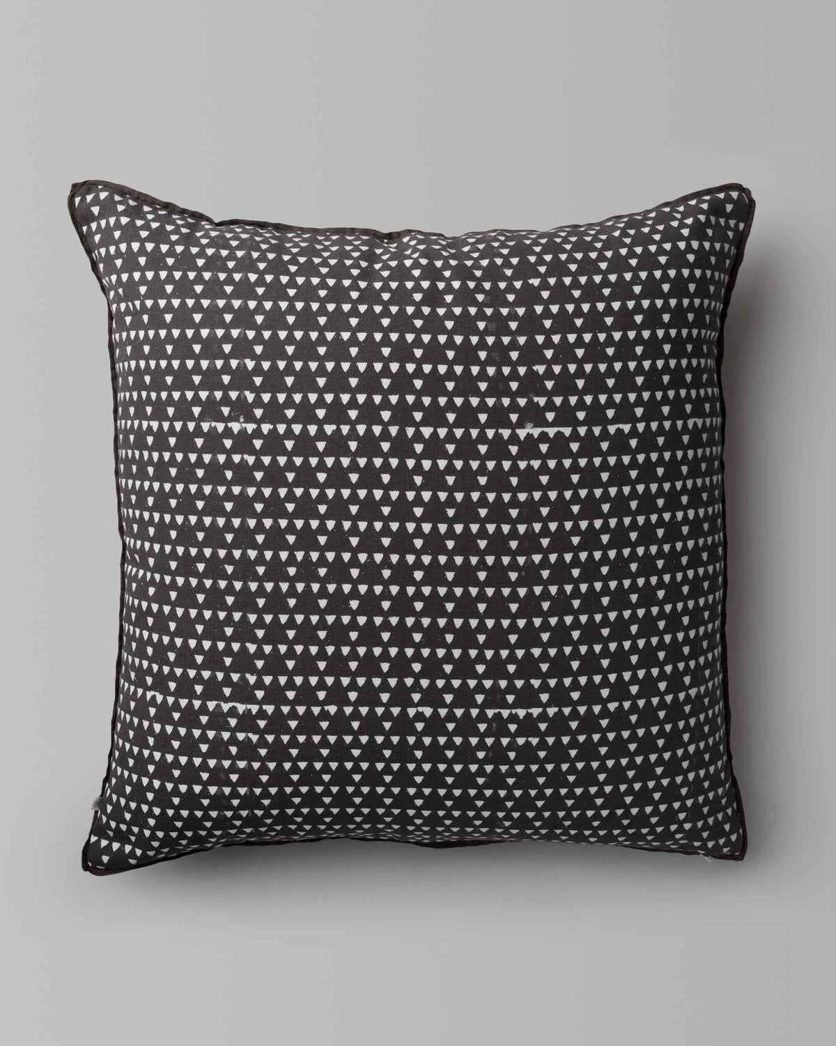 This brown cushion features a deeper brown piping along the edges, and little white triangles, and it pairs well with our Koishi throw, and Sencha cushions