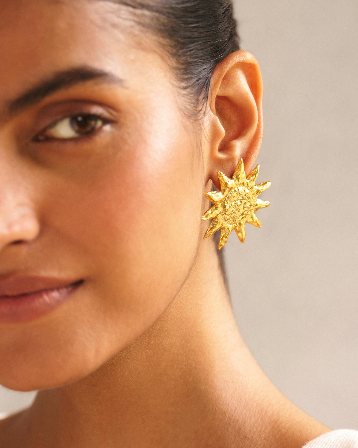 Bold gleaming bits, these earrings are cast in brass, plated in gold, and feature statement sunflowers.