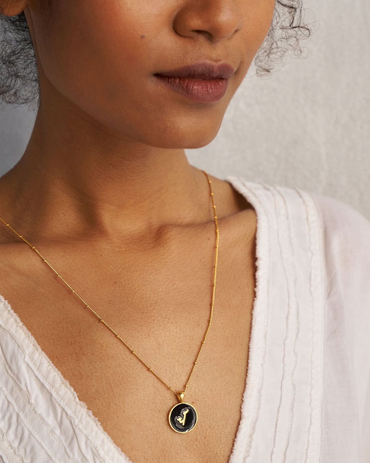With handwritten Devanagari akshar on one side and Roman letter on the other, this gold-plated charm with black enameling is the ideal gift for when you want to make it personal.