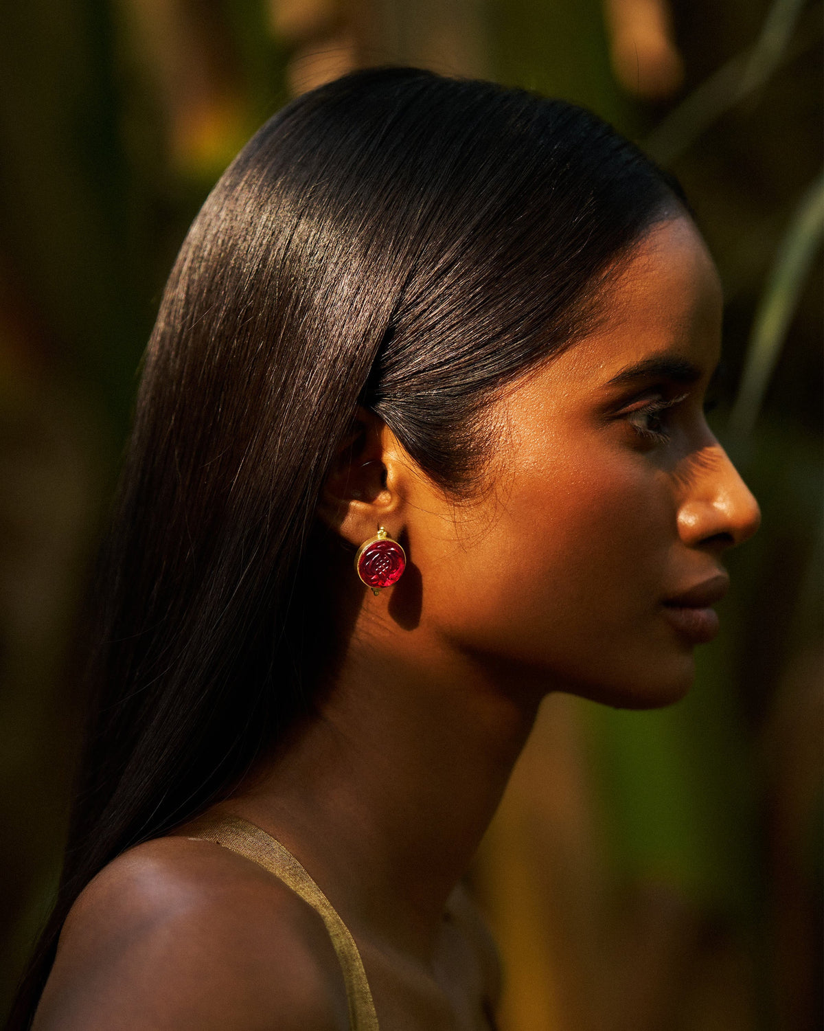 The small Anar Glass Seal Studs are hand-carved red glass seal studs, crafted in the vibrant streets of Jaipur. Delicate yet bold, they offer a lightweight statement perfect for any occasion.
