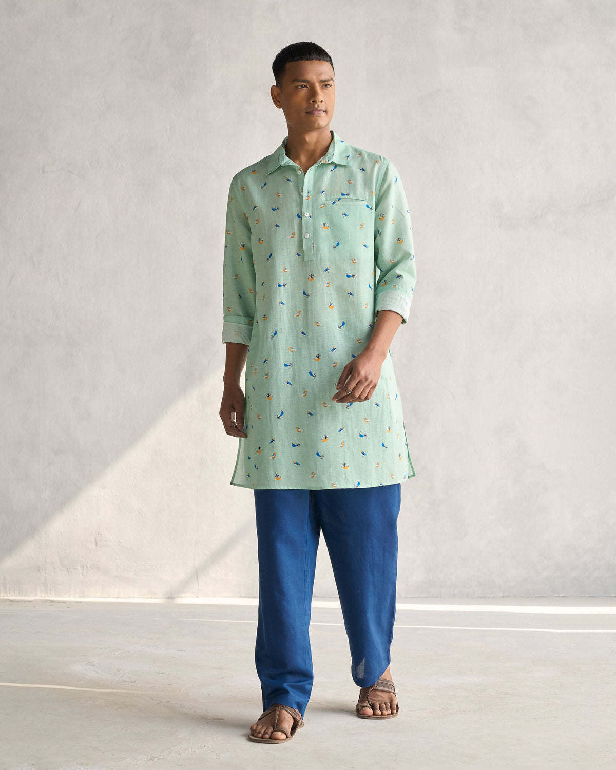 • Whether it's a formal event or a casual outing, the Bouquet Kurta’s sage green hue and bird motifs bring an edge to outfits, making this kurta a go-to choice for various occasions.