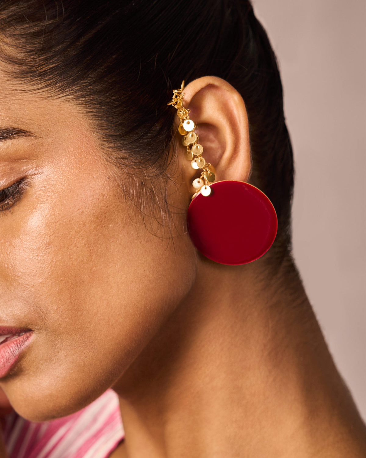 This contemporary interpretation of a traditional red and shimmering gold hair ornament features enamel dot earrings crafted with flooded enamel on a brass circle. As an added touch, the earrings come with a versatile kanauti, or ear chain, which can easily be transformed into a bracelet or anklet.