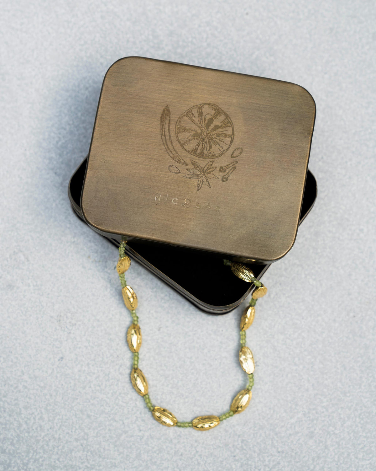 • We've taken our love for spices and added strings of shimmering elaichi and serpentine stones along plated gold to create a twinkling piece to take from desk to dancing.