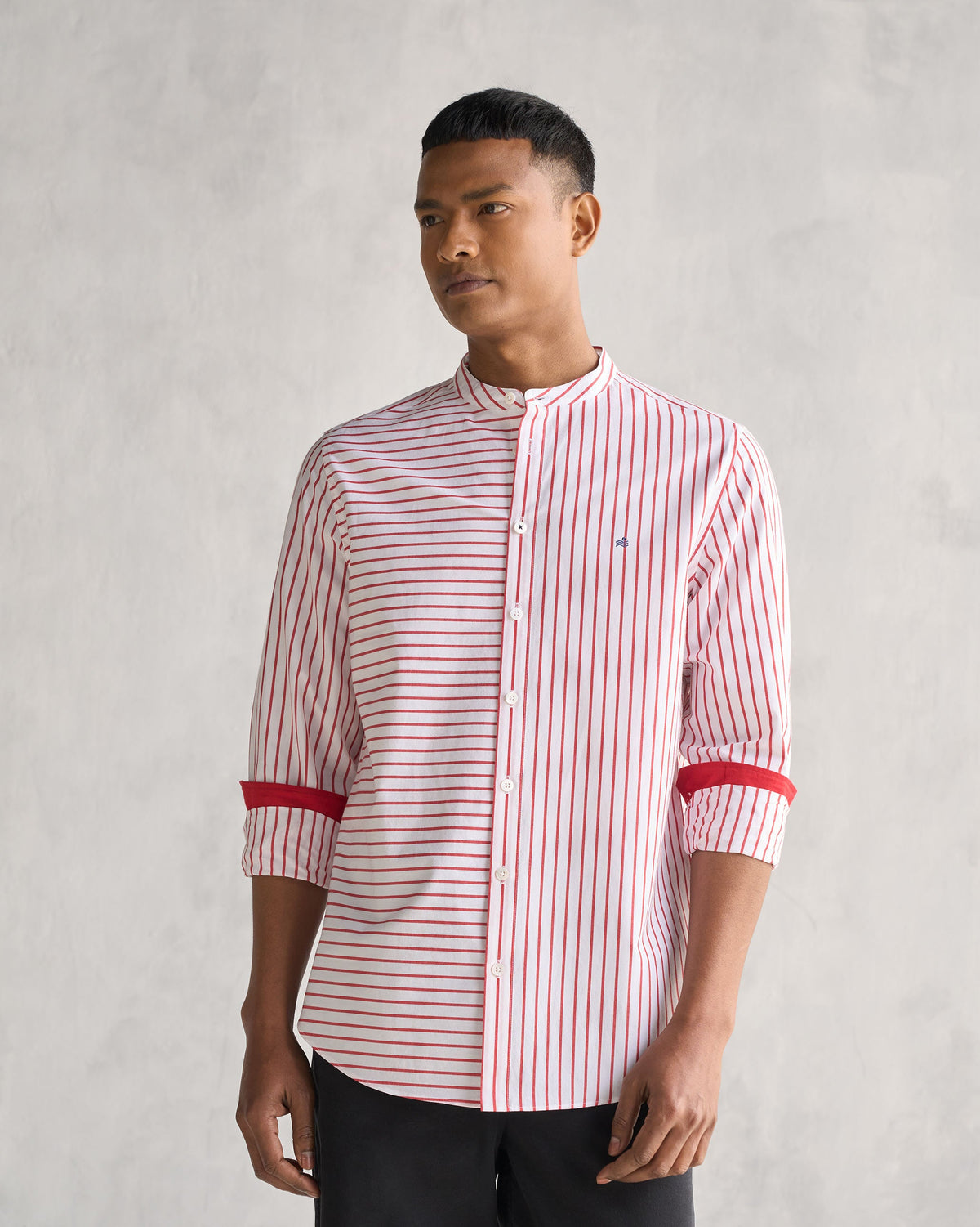 • While embracing modern trends, the Nawab Shirt with a Nehru collar shirt pays homage to tradition. The slim fit and playful stripe design bring a contemporary edge.