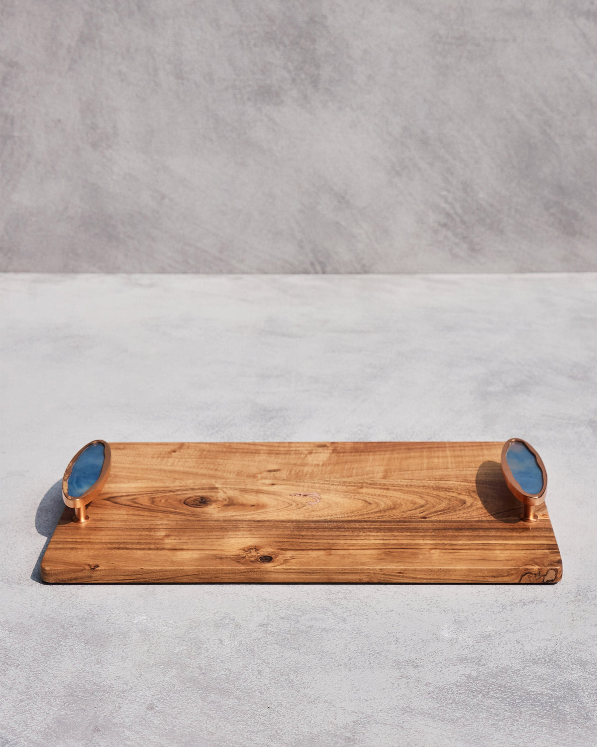 Whether you're hosting a cosy gathering or a big celebration, the Revel Platter is the go-to choice. It's just the right size to hold an array of favourite bites and spreads, making it the ideal companion for all your entertaining needs. With its natural wooden finish, this platter features midnight blue agate handles that add to its design.