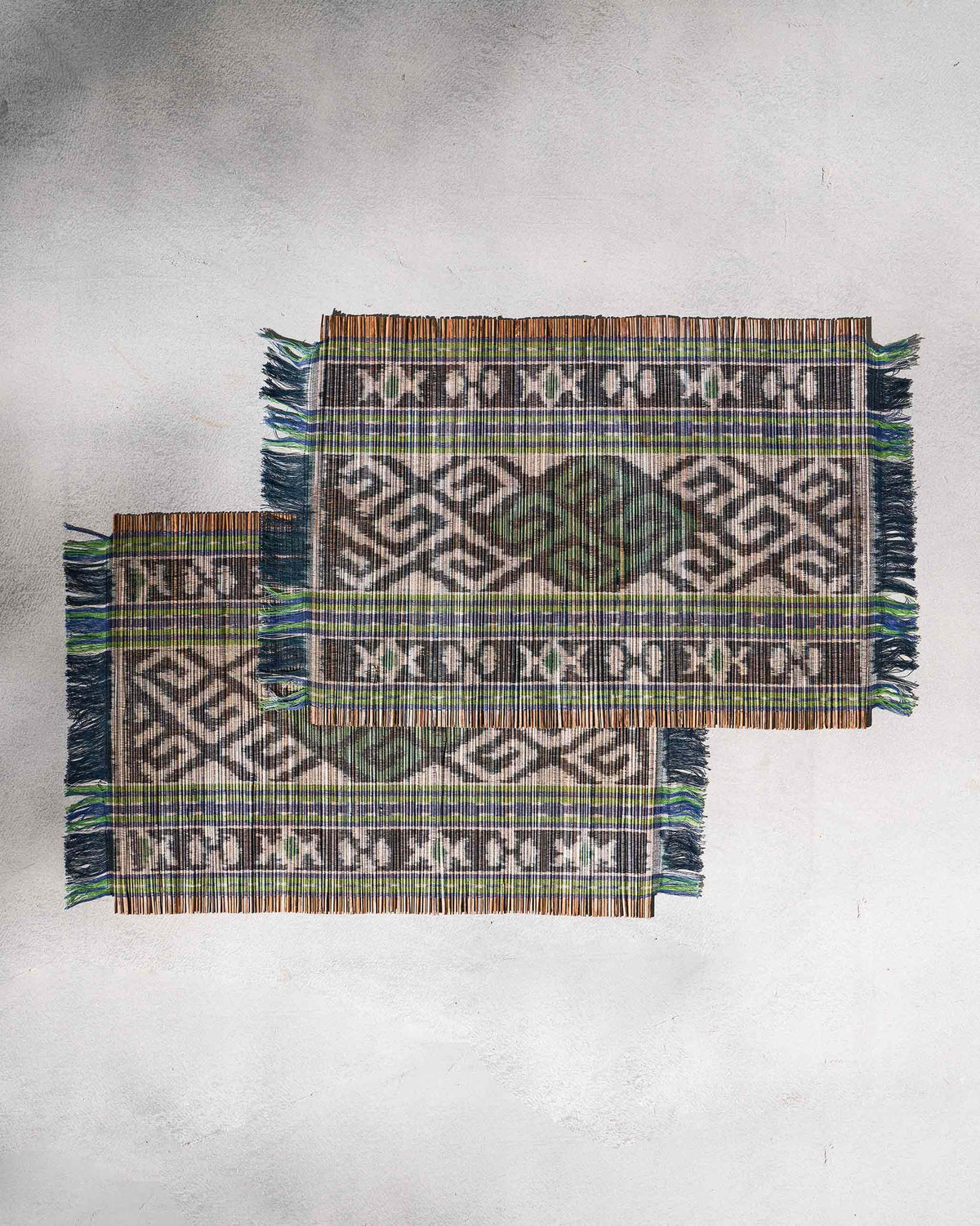 This is an ikat runner made with palm sticks and cotton threads. Ikat is a resist dyeing technique used to create a distinct style of textile patterns. This process involves dyeing specific sections of the yarn before weaving them into the fabric.
