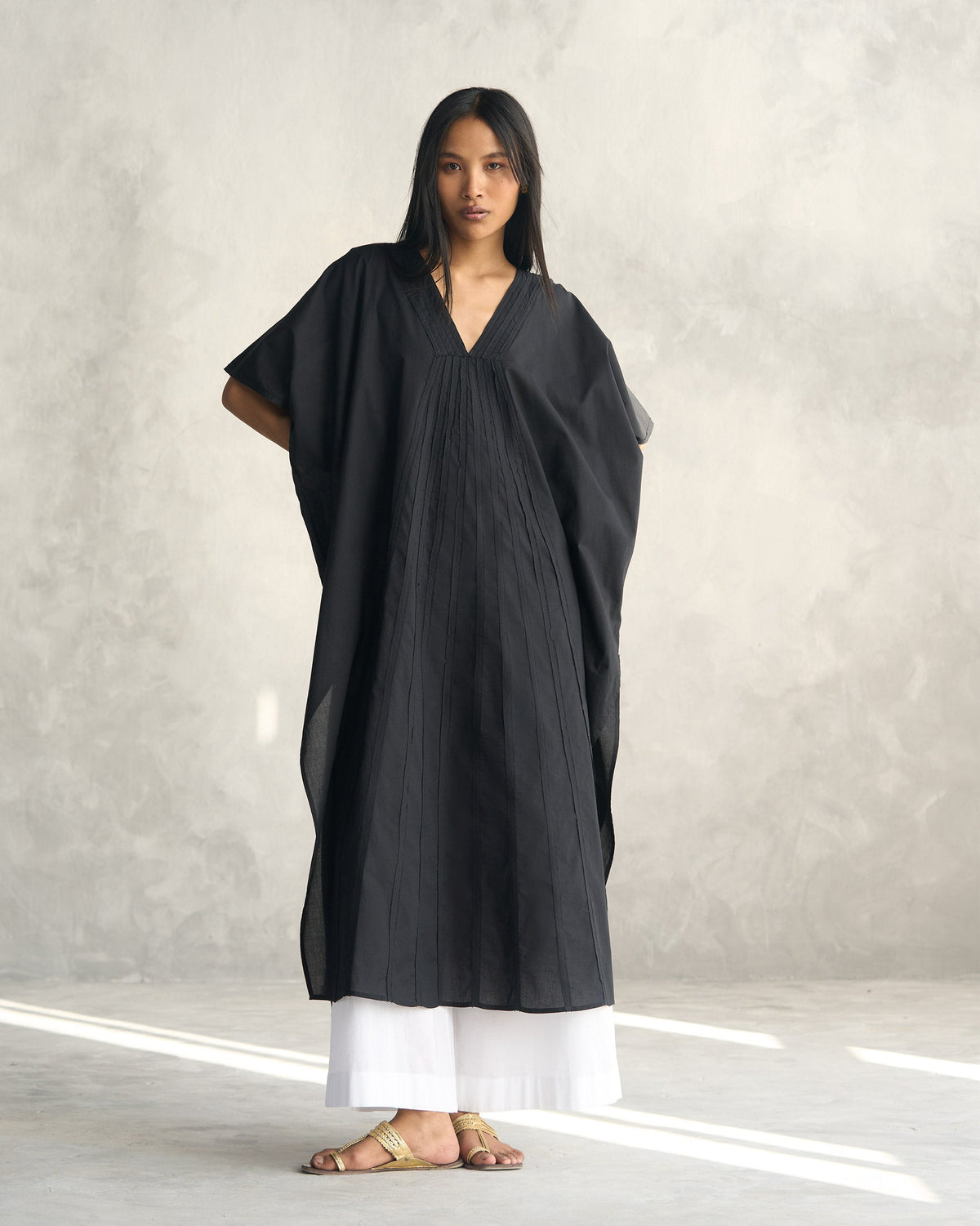 Our calf-grazing cotton kaftan features a v-neck with panels flowing down the front, and a little flourish with frayed edges at the neck, sleeves, and panels.