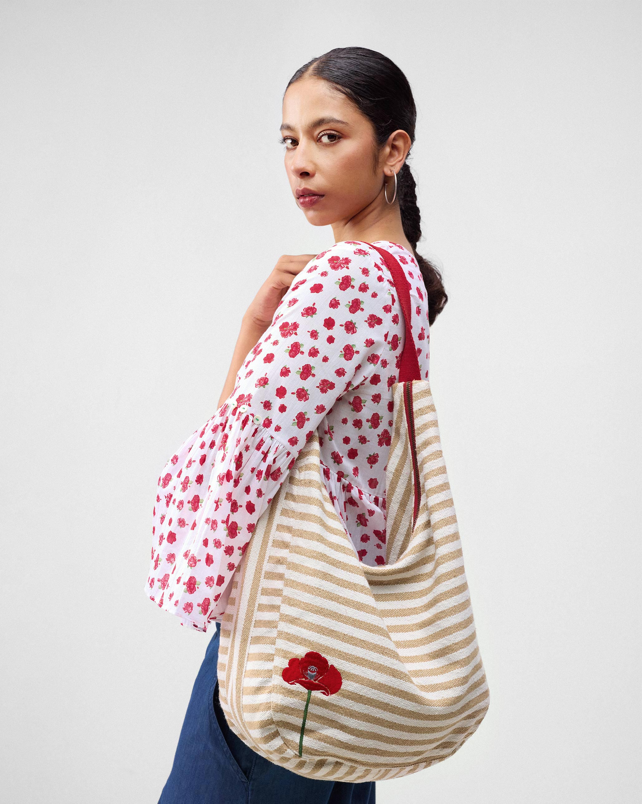 • The Wayfarer Bag is a cool shoulder bag with beige and white stripes. Perfect for when you're on the go.