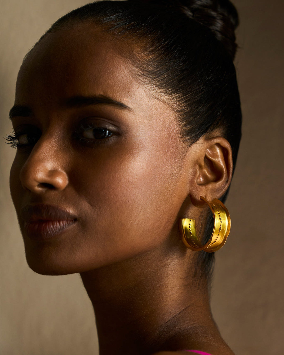 Each piece of Nicobar's Boondi hoops is unique and beautiful. It is handcrafted in brass, plated in gold. Tiny boondi like details on the earrings add to the beauty of the design.