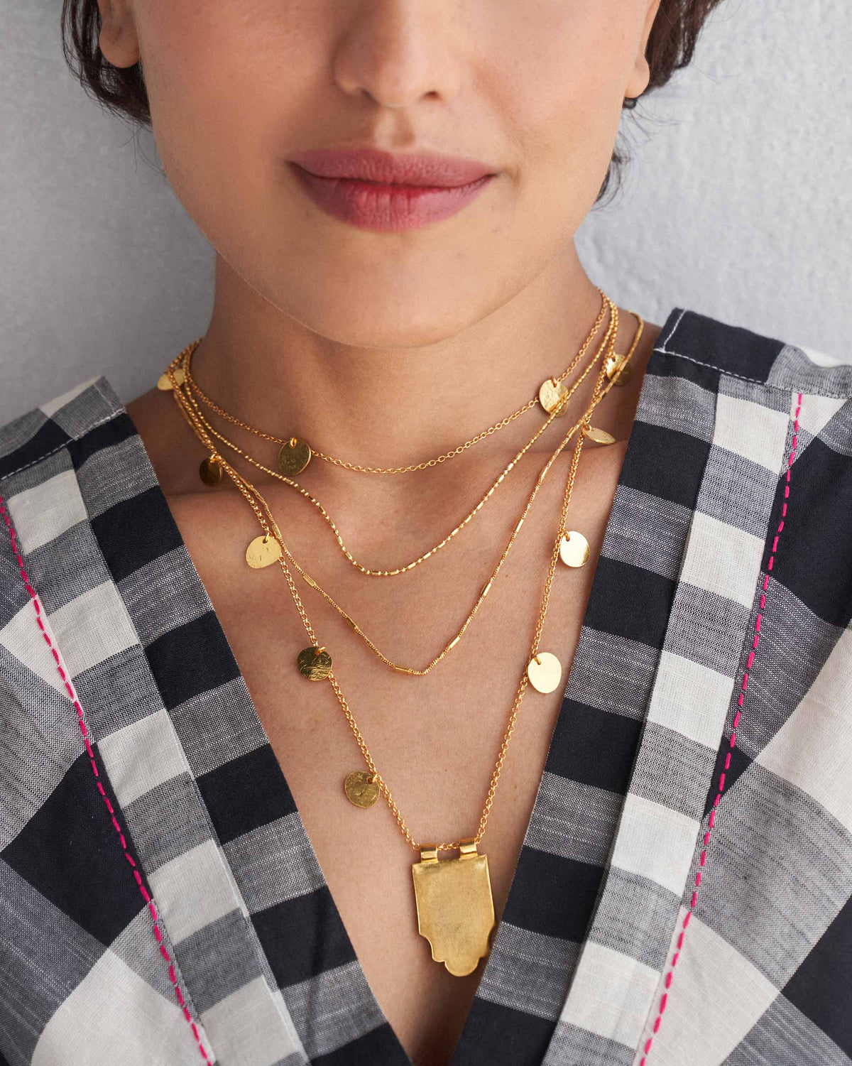 {"id":7585150402740,"title":"Jhil-mil Necklace - Gold","handle":"jhil-mil-necklace-gold","description":"\u003cul\u003e\n\u003cli\u003eThe Jhilmil Necklace is a cluster of multiple chains and charms strung together to create a styled look . The inspiration of this necklace lies in the architectural structures in the Stone Town bazaar of Zanzibar.\n\u003c\/li\u003e\n\u003cli\u003eThe necklace is cast in brass and plated in gold. \n\u003c\/li\u003e\n\u003cli\u003eA statement when styled alone, but pairs seamlessly when layered with your usual favourites.\n\u003c\/li\u003e\n\u003cli\u003eComes in a gift box.\u003c\/li\u003e\n\u003c\/ul\u003e","published_at":"2024-04-20T03:09:30+05:30","created_at":"2024-04-09T01:19:13+05:30","vendor":"Nicobar","type":"Necklaces","tags":["Campaign_Forloversofsparkle","Campaign_zanzibar10apr24","Category_Gift Box","COLLECTION_ EOSS","COLLECTION_SS24ZANZIBAR","eoss_just_added","Filtercategory_Jewellery","Filterclass_Necklace","Filtersubcategory_Necklace","Filtersubclass_Necklace","Gender_Female","jhil-mil-necklace-goldNBI033685","Material Group_Brass","MATERIAL_Brass \u0026 Gold Plating","oldgstprice_7000","pdpcollection_Zanzibar","Product_Others","showsimilarproductfirst"],"price":10500,"price_min":10500,"price_max":10500,"available":false,"price_varies":false,"compare_at_price":null,"compare_at_price_min":0,"compare_at_price_max":0,"compare_at_price_varies":false,"variants":[{"id":42896106160308,"title":"Gold \/ 60 cm","option1":"Gold","option2":"60 cm","option3":null,"sku":"NBI033685","requires_shipping":true,"taxable":true,"featured_image":null,"available":false,"name":"Jhil-mil Necklace - Gold - Gold \/ 60 cm","public_title":"Gold \/ 60 cm","options":["Gold","60 cm"],"price":10500,"weight":0,"compare_at_price":null,"inventory_management":"shopify","barcode":null,"requires_selling_plan":false,"selling_plan_allocations":[],"quantity_rule":{"min":1,"max":null,"increment":1}}],"images":["\/\/global.nicobar.com\/cdn\/shop\/files\/NBI033685_1_482d26ae-f29a-44c0-b046-87e412857626.jpg?v=1729209111","\/\/global.nicobar.com\/cdn\/shop\/files\/NBI033685_2_8a18ef5b-28d8-412a-bcc2-d46155cc11fc.jpg?v=1729209111","\/\/global.nicobar.com\/cdn\/shop\/files\/NBI033685_3_9b4f76db-80a9-4514-8e9d-0d3399dfd2ca.jpg?v=1729209111","\/\/global.nicobar.com\/cdn\/shop\/files\/NBI033685_4_ad23c56f-84a9-41b2-a662-dc4a36b7417b.jpg?v=1729209111","\/\/global.nicobar.com\/cdn\/shop\/files\/NBI033685_5_8ca88c25-efda-4bc2-b811-210dfe4ab2e1.jpg?v=1729209111","\/\/global.nicobar.com\/cdn\/shop\/files\/NBI033685_6_84a6916a-10cb-4b2d-baab-f08ac2b000ce.jpg?v=1729209111","\/\/global.nicobar.com\/cdn\/shop\/files\/NBI033685_7_89347c67-9810-418e-96b0-27fa87f3b3e6.jpg?v=1729209111"],"featured_image":"\/\/global.nicobar.com\/cdn\/shop\/files\/NBI033685_1_482d26ae-f29a-44c0-b046-87e412857626.jpg?v=1729209111","options":["Color","Size"],"media":[{"alt":null,"id":30875398209716,"position":1,"preview_image":{"aspect_ratio":0.8,"height":2574,"width":2058,"src":"\/\/global.nicobar.com\/cdn\/shop\/files\/NBI033685_1_482d26ae-f29a-44c0-b046-87e412857626.jpg?v=1729209111"},"aspect_ratio":0.8,"height":2574,"media_type":"image","src":"\/\/global.nicobar.com\/cdn\/shop\/files\/NBI033685_1_482d26ae-f29a-44c0-b046-87e412857626.jpg?v=1729209111","width":2058},{"alt":null,"id":30875398242484,"position":2,"preview_image":{"aspect_ratio":0.8,"height":2574,"width":2058,"src":"\/\/global.nicobar.com\/cdn\/shop\/files\/NBI033685_2_8a18ef5b-28d8-412a-bcc2-d46155cc11fc.jpg?v=1729209111"},"aspect_ratio":0.8,"height":2574,"media_type":"image","src":"\/\/global.nicobar.com\/cdn\/shop\/files\/NBI033685_2_8a18ef5b-28d8-412a-bcc2-d46155cc11fc.jpg?v=1729209111","width":2058},{"alt":null,"id":30875398275252,"position":3,"preview_image":{"aspect_ratio":0.8,"height":2574,"width":2058,"src":"\/\/global.nicobar.com\/cdn\/shop\/files\/NBI033685_3_9b4f76db-80a9-4514-8e9d-0d3399dfd2ca.jpg?v=1729209111"},"aspect_ratio":0.8,"height":2574,"media_type":"image","src":"\/\/global.nicobar.com\/cdn\/shop\/files\/NBI033685_3_9b4f76db-80a9-4514-8e9d-0d3399dfd2ca.jpg?v=1729209111","width":2058},{"alt":null,"id":30875398308020,"position":4,"preview_image":{"aspect_ratio":0.8,"height":2574,"width":2058,"src":"\/\/global.nicobar.com\/cdn\/shop\/files\/NBI033685_4_ad23c56f-84a9-41b2-a662-dc4a36b7417b.jpg?v=1729209111"},"aspect_ratio":0.8,"height":2574,"media_type":"image","src":"\/\/global.nicobar.com\/cdn\/shop\/files\/NBI033685_4_ad23c56f-84a9-41b2-a662-dc4a36b7417b.jpg?v=1729209111","width":2058},{"alt":null,"id":30875398340788,"position":5,"preview_image":{"aspect_ratio":0.8,"height":2574,"width":2058,"src":"\/\/global.nicobar.com\/cdn\/shop\/files\/NBI033685_5_8ca88c25-efda-4bc2-b811-210dfe4ab2e1.jpg?v=1729209111"},"aspect_ratio":0.8,"height":2574,"media_type":"image","src":"\/\/global.nicobar.com\/cdn\/shop\/files\/NBI033685_5_8ca88c25-efda-4bc2-b811-210dfe4ab2e1.jpg?v=1729209111","width":2058},{"alt":null,"id":30875398373556,"position":6,"preview_image":{"aspect_ratio":0.8,"height":2574,"width":2058,"src":"\/\/global.nicobar.com\/cdn\/shop\/files\/NBI033685_6_84a6916a-10cb-4b2d-baab-f08ac2b000ce.jpg?v=1729209111"},"aspect_ratio":0.8,"height":2574,"media_type":"image","src":"\/\/global.nicobar.com\/cdn\/shop\/files\/NBI033685_6_84a6916a-10cb-4b2d-baab-f08ac2b000ce.jpg?v=1729209111","width":2058},{"alt":null,"id":30875398406324,"position":7,"preview_image":{"aspect_ratio":0.8,"height":2574,"width":2058,"src":"\/\/global.nicobar.com\/cdn\/shop\/files\/NBI033685_7_89347c67-9810-418e-96b0-27fa87f3b3e6.jpg?v=1729209111"},"aspect_ratio":0.8,"height":2574,"media_type":"image","src":"\/\/global.nicobar.com\/cdn\/shop\/files\/NBI033685_7_89347c67-9810-418e-96b0-27fa87f3b3e6.jpg?v=1729209111","width":2058}],"requires_selling_plan":false,"selling_plan_groups":[],"content":"\u003cul\u003e\n\u003cli\u003eThe Jhilmil Necklace is a cluster of multiple chains and charms strung together to create a styled look . The inspiration of this necklace lies in the archite