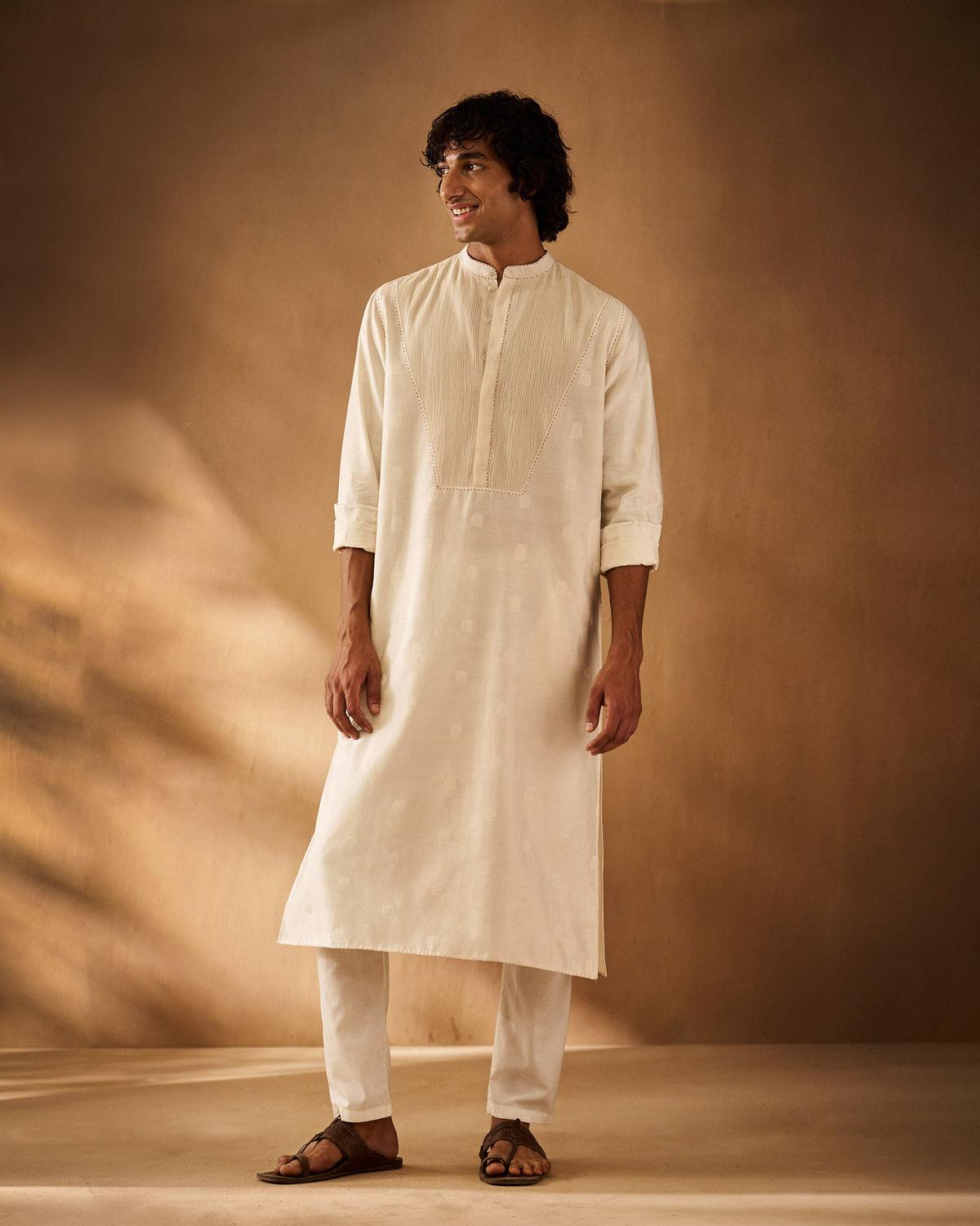 The kurta floats lighter than air, crafted in a buttery soft mix of cotton and silk.