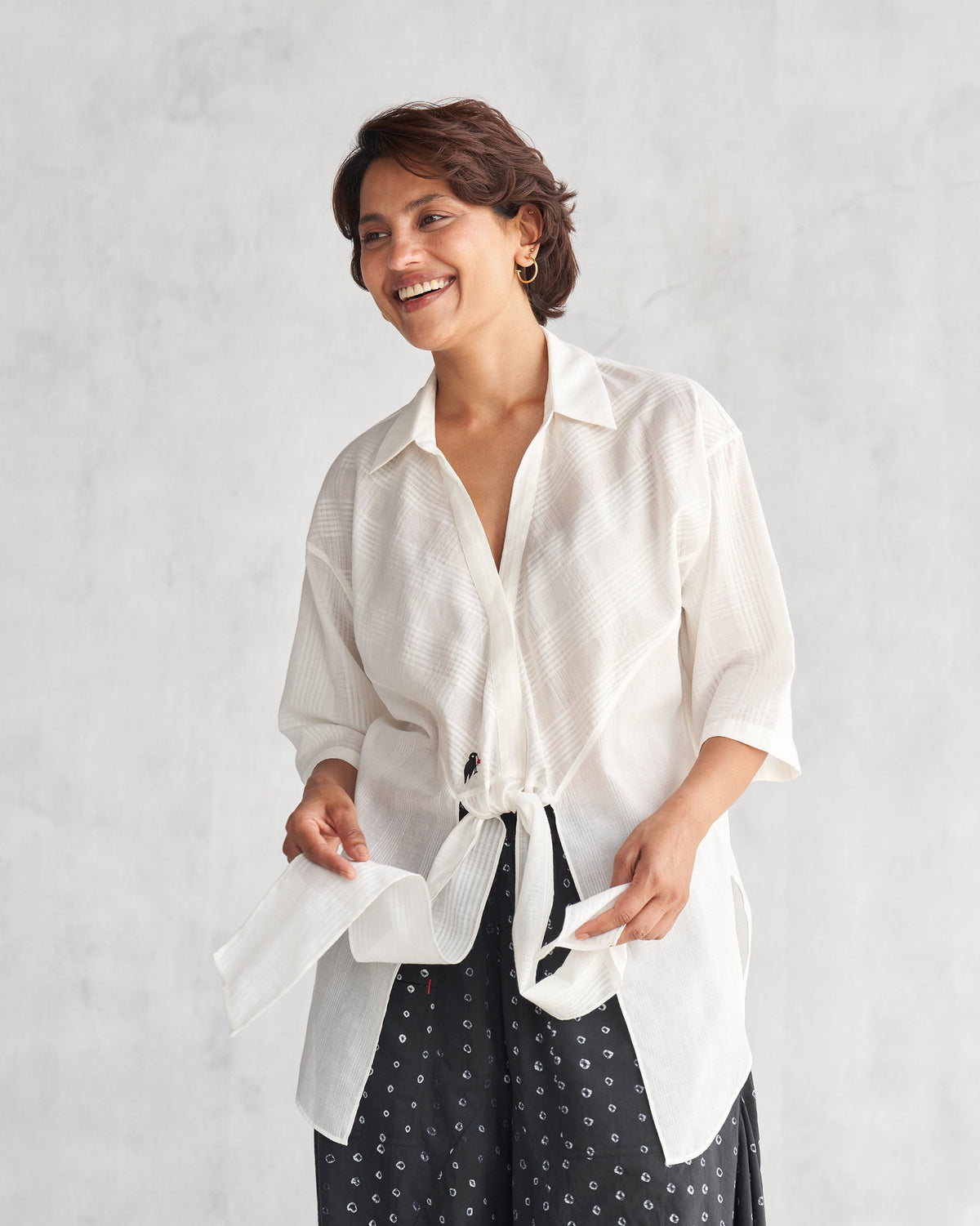 A playful spin on the classic summer shirt, the Naomi Shirt’s uniquely falling silhouette is close to a collectible. Its charming tie-up detail adds a touch of femininity and flair to any ensemble.