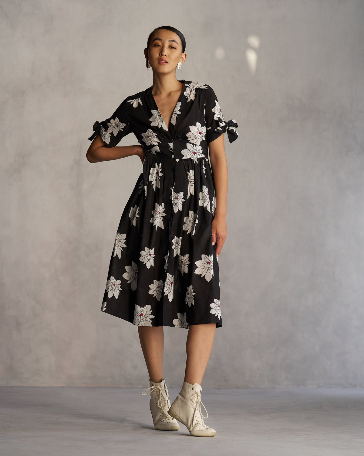 Our Button Down Dress is pure bliss – romantic, breezy, and sexy as hell. Put it on and feel incredible. It comes with bow-tie sleeves, a v-neck, pockets, and a length that falls just below the knee.