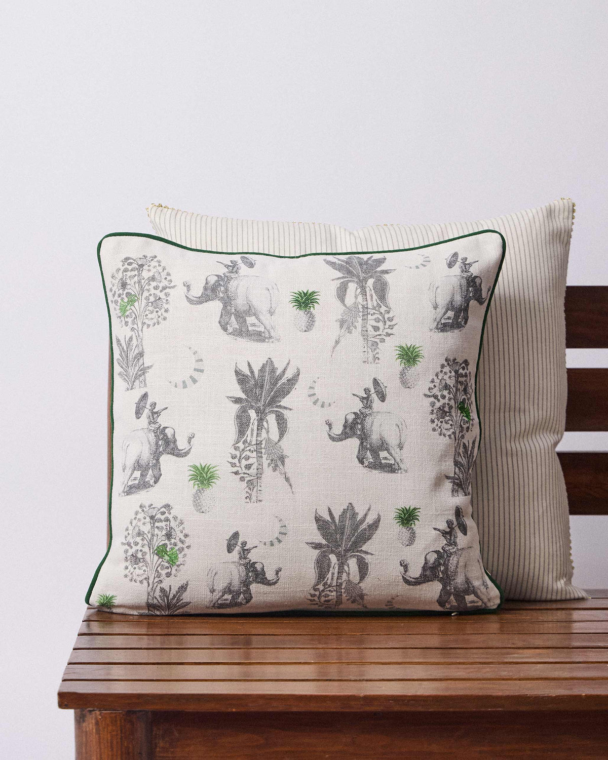 Inspired by the lush flora and fauna of Sri Lanka, the Ceylon Trail Cushion Cover features whimsical elements digi-printed on durable cotton slub with solid green piping.