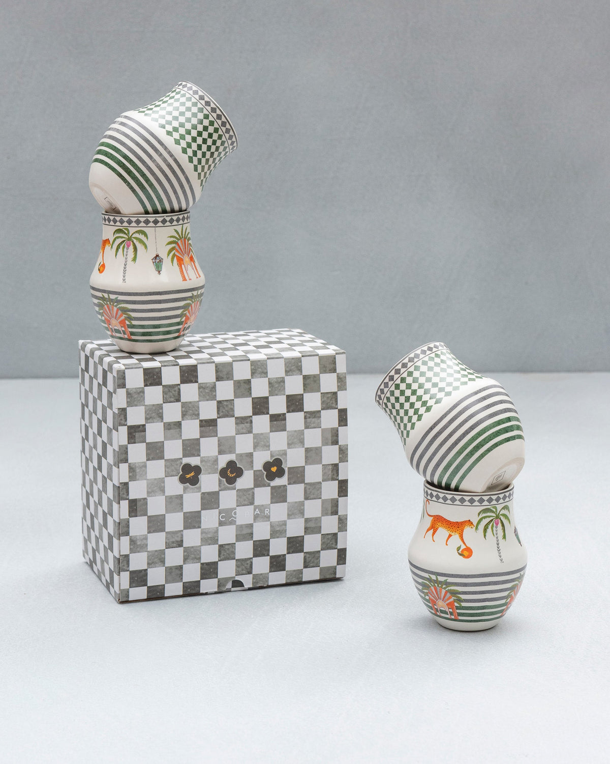 The colours and textures of Marrakech meet whimsical illustrations with leopards, roses and dragonflies on a tiled background, all inspired by our travels in the Dessert Palm Kulhars.