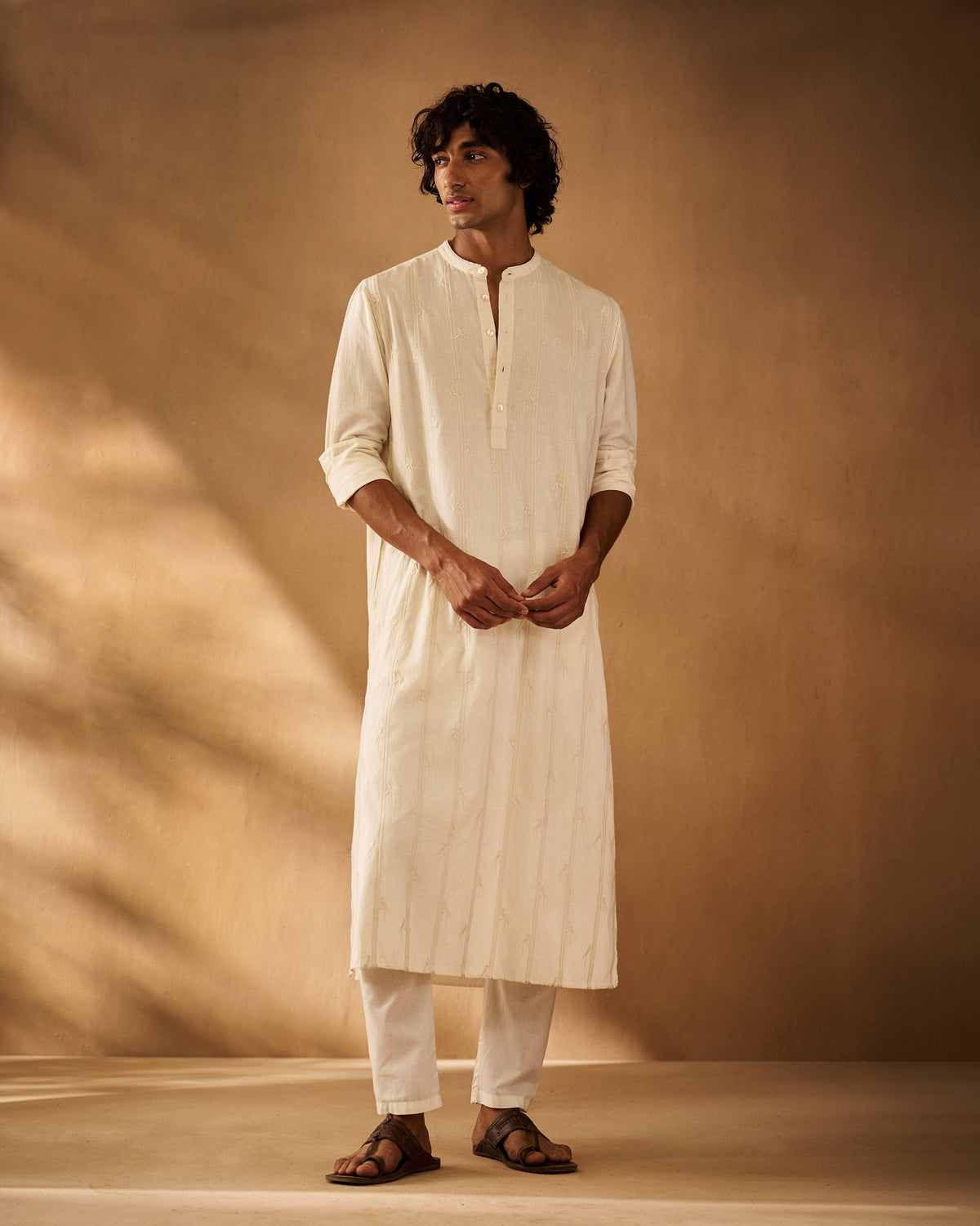The kurta floats lighter than air, crafted in soft handwoven cotton.