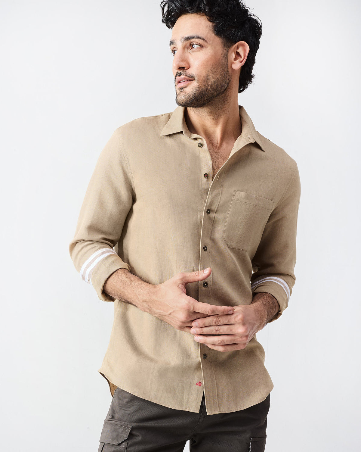 Cut from a breathable linen-cotton blend in solid khaki, with travel twill tape tucked inside the neckband, and subtle red accents—a star at the sleeve placket and a bold second button on the front.