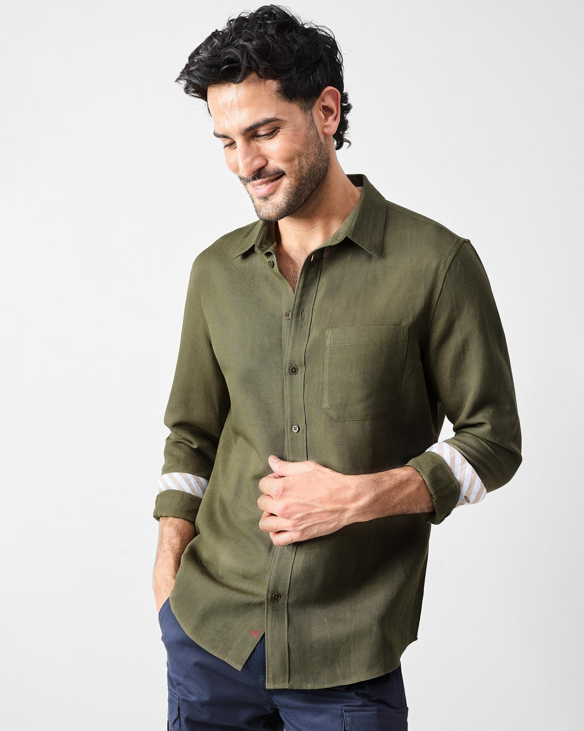 Cut from a breathable linen-cotton blend in solid olive, with travel twill tape tucked inside the neckband, and subtle red accents—a star at the sleeve placket and a bold second button on the front.