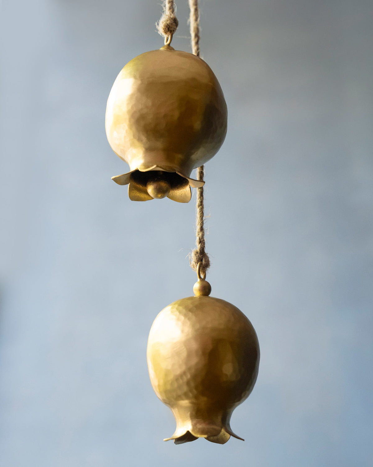 • Crafted in iron with a matte gold finish, these two bells hang at the end of a looped rope and will sit perfectly at your main doorway