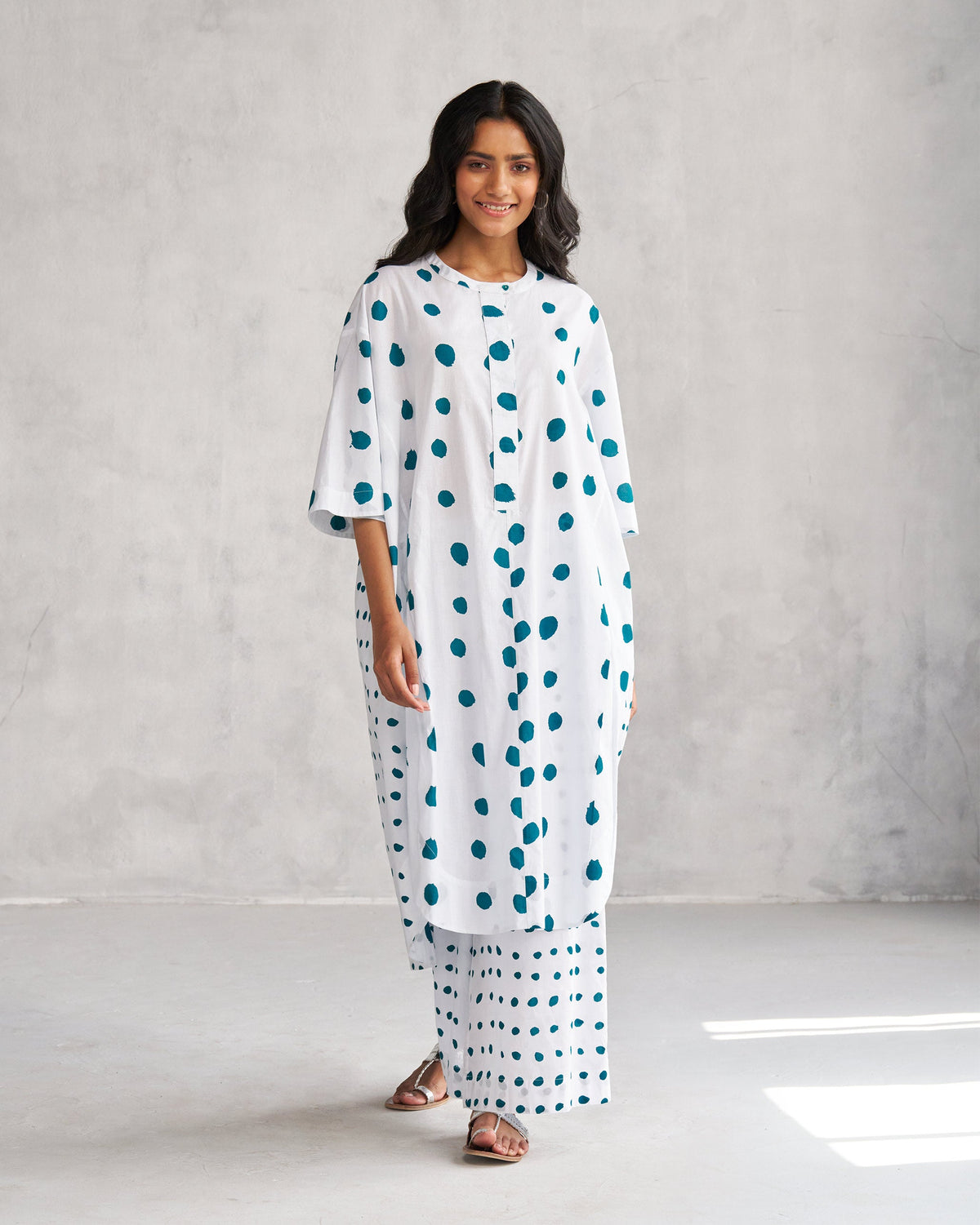 The Boba Panelled Kurta is designed for days of discovery. Easy, breezy, this kurta isn't afraid to have fun! The relaxed fit with a white base creates a blank canvas for the teal polkas.