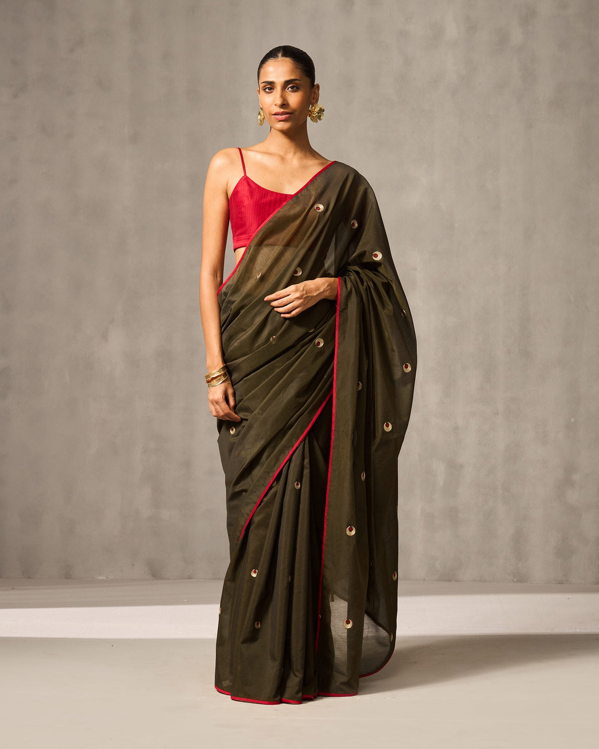 A dreamy piece for the festivities or everyday, the Chandni Sari is a festive delight with embroidered double moon motifs against a deep green base. The moon is a motif cherished in both Nicobar and Moroccan cultures, the moon symbolises new beginnings and life’s cycles, reflecting renewal and transformation.