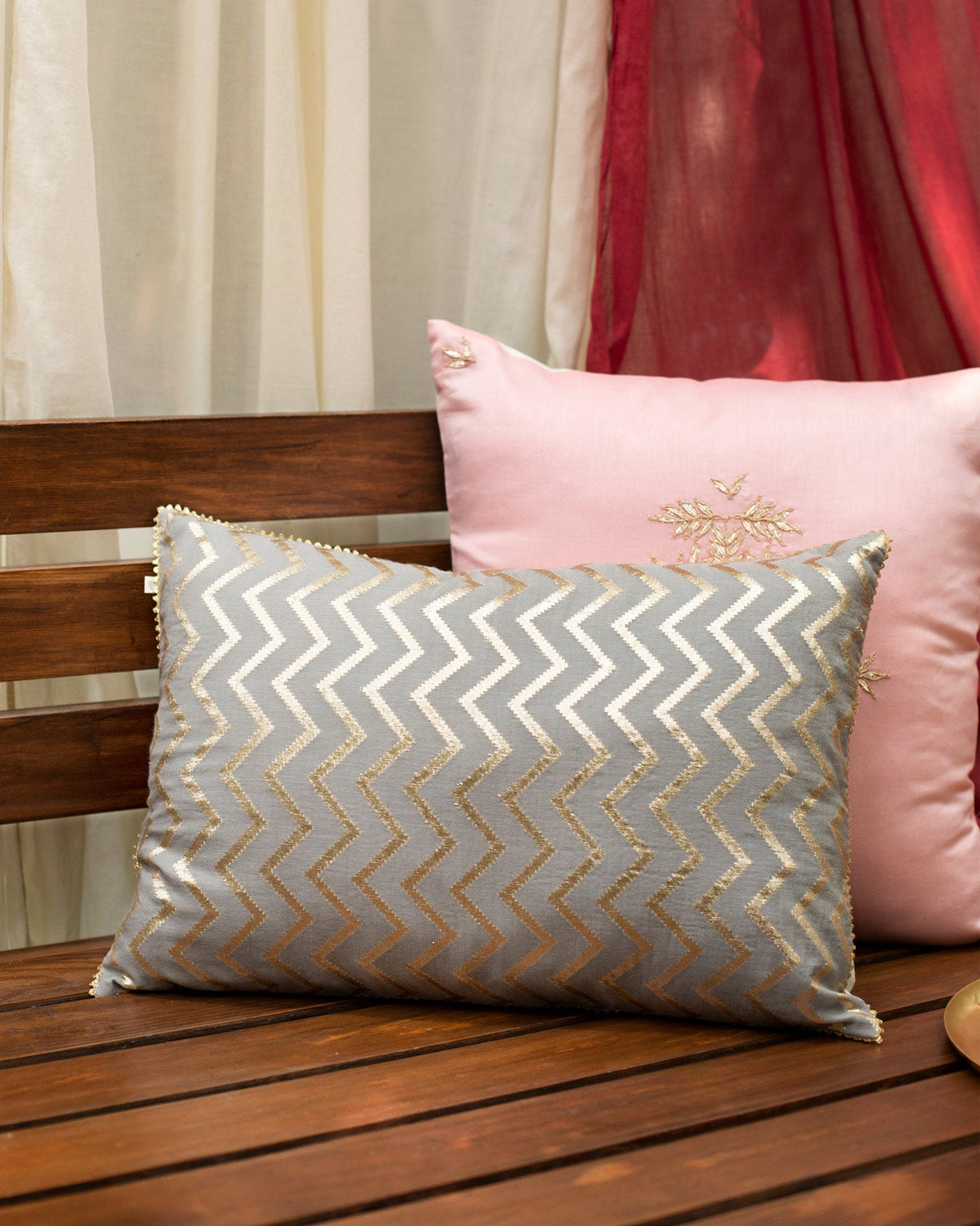 • Crafted in chanderi, this is an eye-catching yet pared-back cushion cover with intricate gota patti embroidery