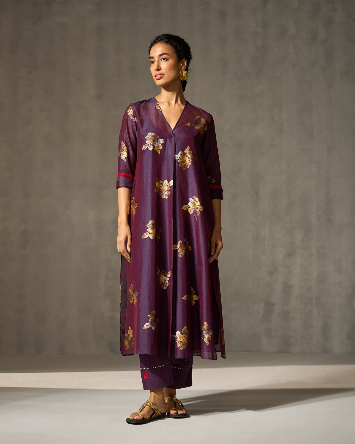 The Front Pleated Kurta comes in a rich purple and gold print with foiled roses all over and comes with a slip. The roses are inspired by our travels to Morocco, symbolizing love, beauty, and purity, and are prominently featured in weddings, festivals, and religious ceremonies.