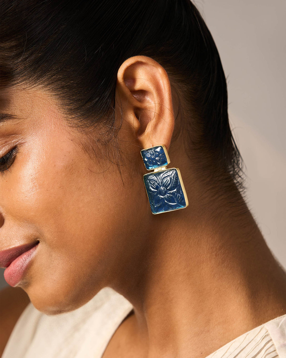 Featuring beautifully hand-carved blue glass, these earrings offer a unique aesthetic. Lightweight yet striking, they make a bold statement.