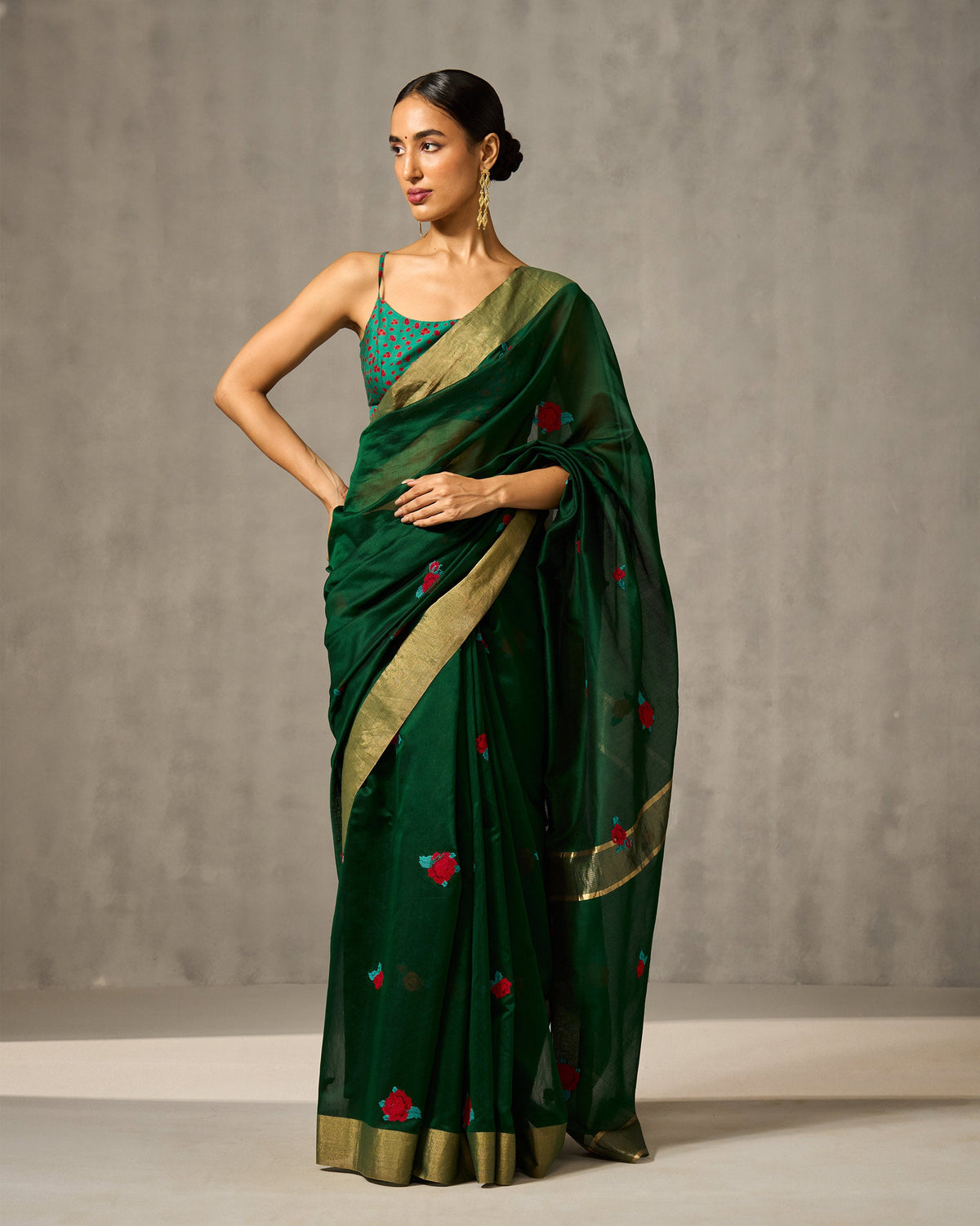 A dreamy piece for the festivities or everyday, the Gulab Sari is a festive delight with embroidered roses and a gold zari border. The roses are inspired by our travels to Morocco, symbolizing love, beauty, and purity, and are prominently featured in weddings, festivals, and religious ceremonies.