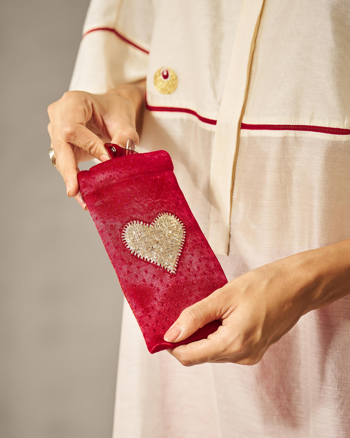 A stylish vase for your glasses, the Happy Hearts Spec Case features a silver gota heart patch on both the sides with red thread stitch on a fuschsia and red base of viscose mashru.