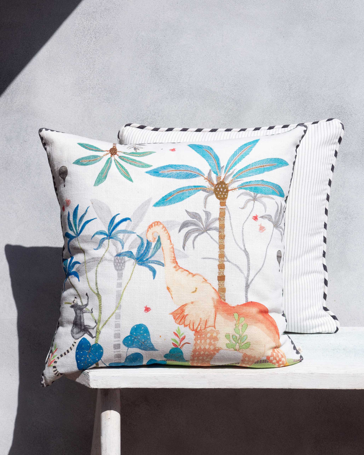 Bring home the heart of the wild with the striking Jungle Cushion Cover inspired by Zanzibar's lush flora and fauna. The cushion features captivating motifs of trumpeting elephants, swinging lemurs and breezy palms. The back of the cushion has a striped green background, letting you play with the bold print or with classic stripes for your setting.
